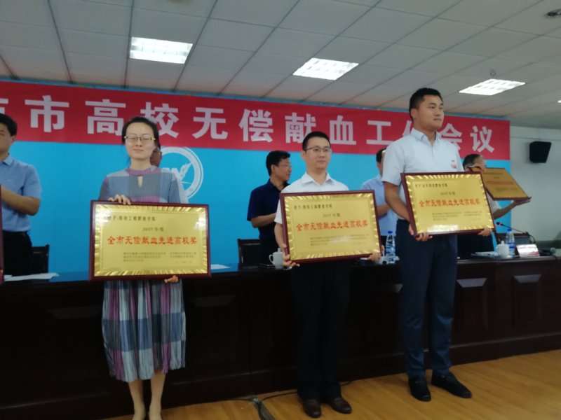 会议对2017年无偿献血事业中表现突出的单位和个人进行了表彰。我院被授予“2017年全市无偿献血先进高校奖”,学生社团“青年志愿者协会”荣获“2017年全市高校无偿献血志愿服务先进集体奖”,陈锋、李楠等18位师生分别荣获“2017年全省无偿献血先进个人”、“2017年度全省无偿献血爱心大学生”、“2017年度全市无偿献血爱心大学生” 等多项荣誉称号。