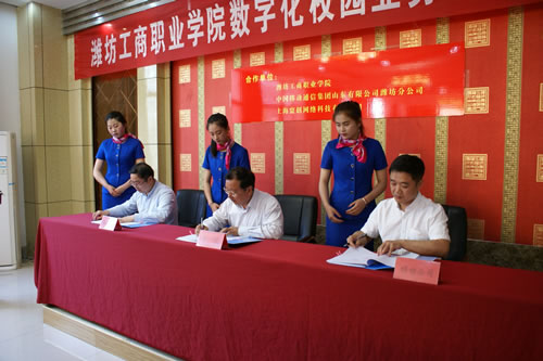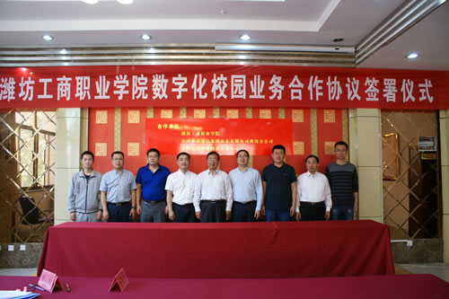 2017年5月23日下午,在国际交流中心219会议室,潍坊工商职业学院院长王传旭与中国移动通信集团山东有限公司诸城分公司王永鹏总经理、上海寰创网络科技有限公司于松来董事长正式签署了数字化校园建设合作项目。