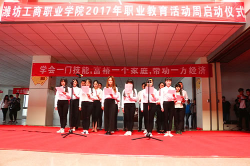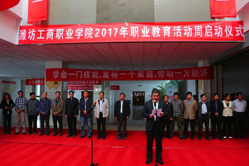 2017年5月9日,潍坊工商职业学院在图书信息楼二楼成功举行2017年职业教育活动周启动仪式。今年的活动主题是“共筑职教梦,喜迎十九大”。党委工作部部长刘国庆同志主持,院长王传旭发表“天天有活动、处处有看点、人人有收获”的重要讲话。这既是我院落实上级有关通知精神,向社会展示学院职业教育改革成果,让社会感受现代职业教育的特色与魅力的一次盛会,也是彰显学院“厚德强能、知行合一”,投身于伟大的现代职业教育国家战略,为各行各业培养具有社会责任感、实践能力和创新精神的职业人的又一重要举措。
