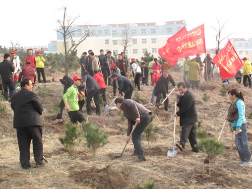 虽然还是料峭春寒,但活动现场热火朝天,学生志愿者们分成五个小组,分工具体,有的同学在地上挖坑,有的同学在搬运树苗,有的同学则在扶树、培土,大家不怕苦、不怕累,争相为播种绿树、美化校园挥洒汗水和热情;由于活动组织有力,安排井然有序,大家通力协作,不到一小时就种植了1200余棵松树,空荒的土地经过师生们的辛勤努力换上了绿色新装。