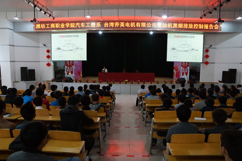 随后,在学院第一学术报告,郭芳彰先生作了关于《智慧型滤烟消音技术》的报告,我院汽车系教师江淑红作了关于《柴油发动机黑烟排放问题探讨》的报告。北汽福田汽车股份有限公司诸城汽车厂、福田雷沃国际重工股份有限公司诸城车辆厂和潍坊市明冠科技公司的相关领导,学院部分领导及汽车工程系的全体师生参加了报告会。