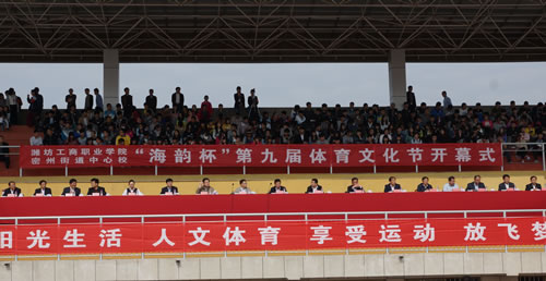 4月26日,潍坊工商职业学院、密州街道中心学校“海韵杯”第九届体育文化节在学院标准田径场隆重开幕。诸城市人民政府副市长许传平、市教育局局长李熙良、市体育局局长李栋、院长王立波及两校领导班子、企业界代表出席了开幕式。许传平副市长宣布体育文化节开幕,李熙良局长、李栋局长、王立波院长分别致辞,开幕式由学院副院长郑立峰主持。