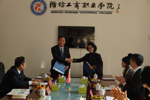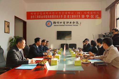 王立波院长首先向来宾致欢迎辞,并介绍了学院基本情况、联合办学状况,较为全面地介绍了学院立足区域汽车机械、食品加工等主导产业发展,着力推进机电工程、汽车工程、机械制造、食品营养与检测等特色专业的建设情况;林贞淑院长对韩国国立庆尚大学的相关情况做了介绍。随后,双方签订了合作意向书,两校就定期开展师生互访交流、相关专业无缝隙对接、开展独特的夏(冬)令营活动等事宜达成意向。