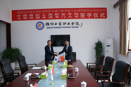 10月16日,学院与韩国永进专门大学在我院国际交流中心达成合作办学协议。韩国永进专门大学国际交流处崔俊教授,我院院长王立波、副院长郑立峰、工会主任唐德良及相关处室负责人参加了签字仪式。