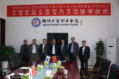 在会谈中,王立波院长指出,潍坊工商职业学院作为诸城市唯一一所高校,在注重服务地方经济社会发展、大力培养高素质技能型人才的同时,十分重视学院发展的国际化和学生发展的国际化,并将国际化作为学院和学生发展的重要增长点之一,目前已与多个国家和地区的高校及机构建立了友好合作关系;他进一步强调指出,中韩两国文化和生活习惯相近,这有助于加强双方的沟通和交流,两校合作潜力巨大,希望双方进一步增强合作与交流。崔俊教授代表永进专门大学表示,潍坊工商职业学院是一所办学质量高、管理严的高校,双方经过多次的沟通和交流,最终能够顺利来访并签署合作协议,必将对双方今后的合作奠定良好基础。