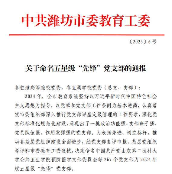 近日,潍坊市委教育工委发布《关于命名五星级“先锋”党支部的通报》中,我校经贸学院党支部、幼教艺术学院党支部、机电与汽车工程学院党支部三个支部被评为五星级“先锋”党支部,表彰其在党建引领、服务群众、创新实践等方面的突出成效,成为基层党组织的示范标杆。