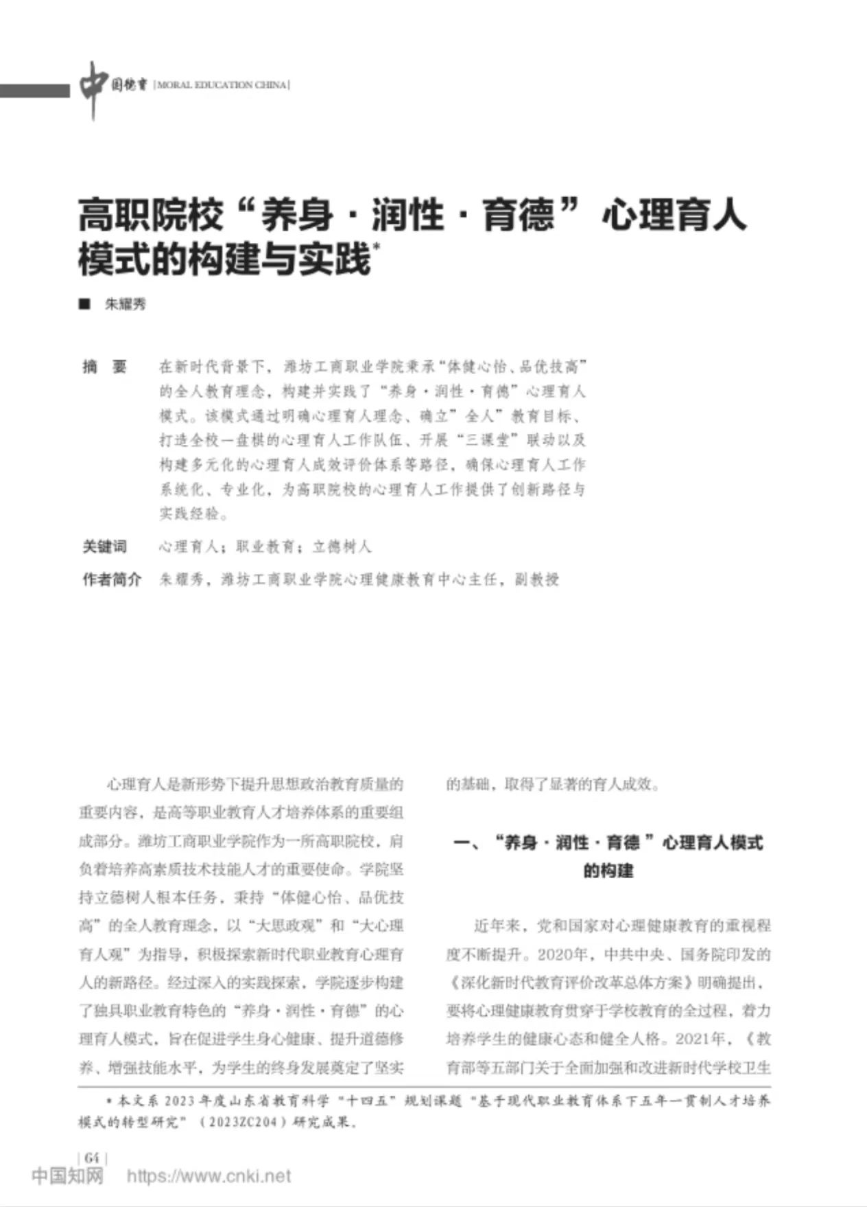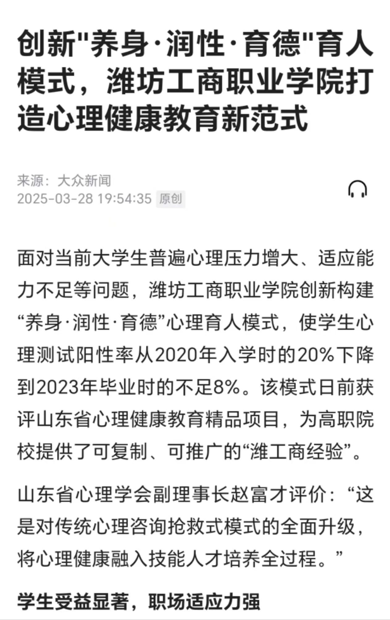 近日,潍坊工商职业学院创新构建的“养身·润性·育德”心理育人模式先后在大众网和国家级期刊《中国德育》上刊发,引发教育界广泛关注。该模式通过整合心理健康教育与职业教育资源,有效提升了学生的心理素养与职业能力,成为高职院校心理健康教育领域的创新典范。