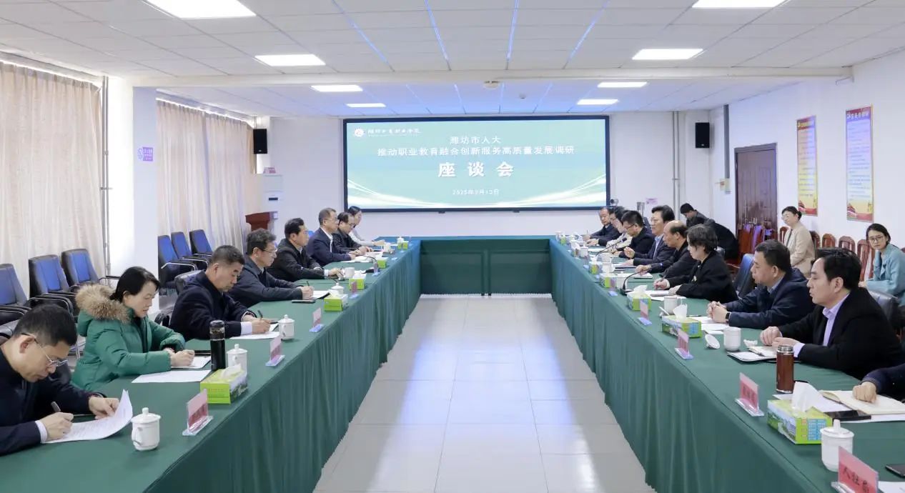 3月12日,潍坊市人大常委会委员、教科文卫委副主任委员董胜勇、刘春强率调研组一行来校,专题调研职业教育融合创新服务高质量发展情况。诸城市人大常委会主任、党组书记赵莉,副主任、教科文卫委主任委员郑晓瑛,市政府正县级干部冯士磊等参加调研,校长张绍秋,执行校长、党委常务副书记郑志松及诸城市教体局、发改局、工信局、财政局、人社局及相关企业负责同志陪同调研座谈。