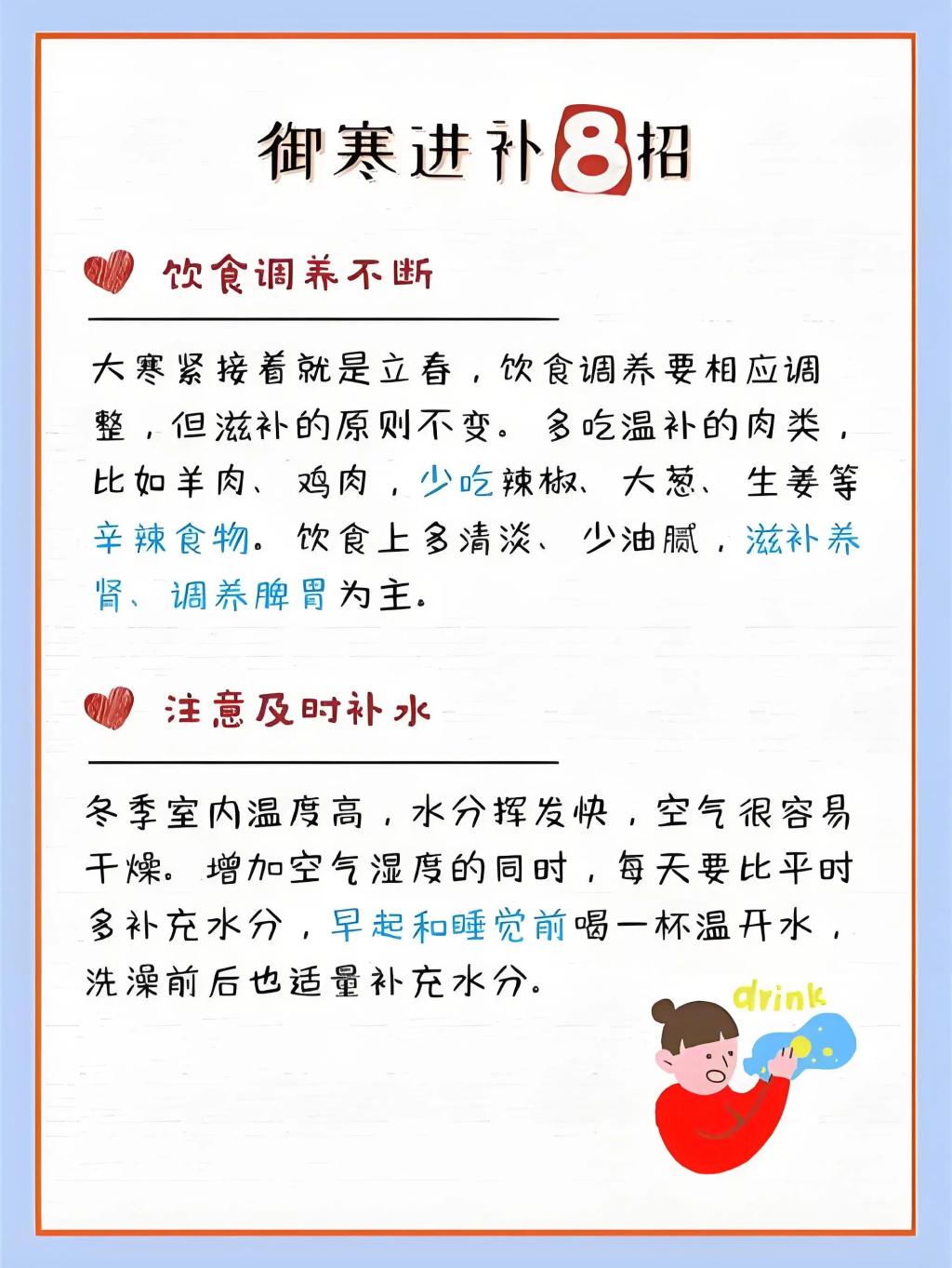 我们要保暖防寒,大寒时节,气温低下,人体容易受到寒冷的侵袭。还要饮食的调养,大寒时节,我们要注意饮食养,多吃一些温补的食物。最好还要适度运动,可以增强身体抵抗力,预防疾病。当然最重要的是规律作息,在大寒时节,我们要保持规律的作息,早睡晚起,避免熬夜,以保持身体和精神的健康。还要保持愉快的心情哟。