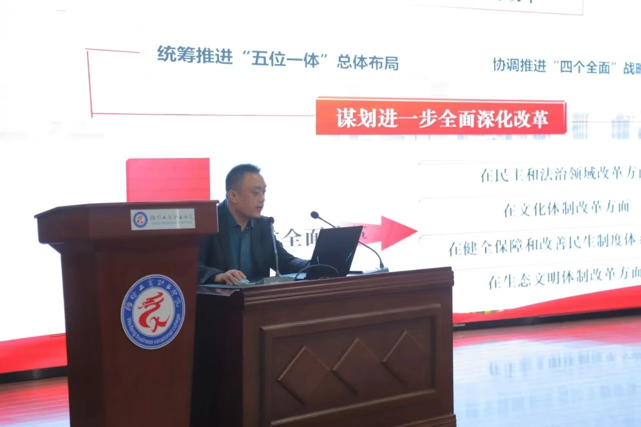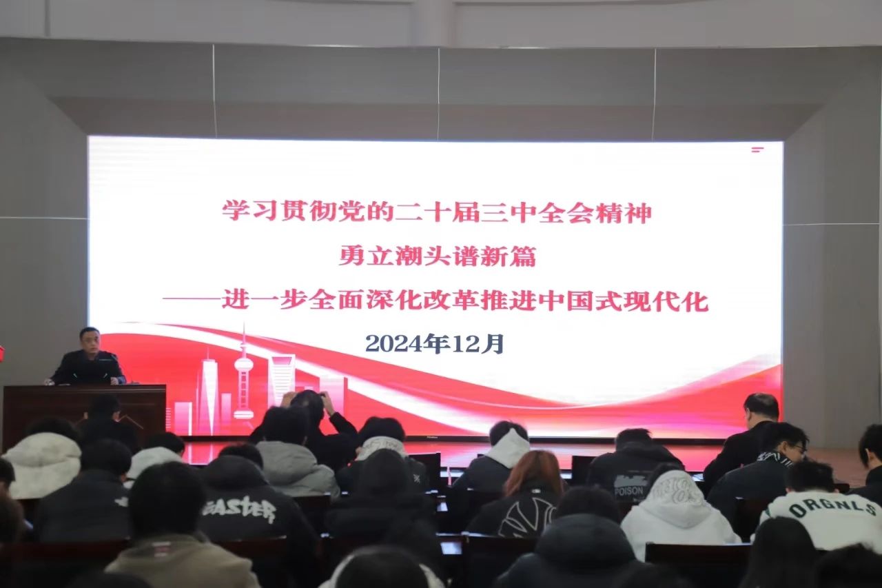 12月5日,我校马克思主义学院邀请山东省教育工委派驻我校党建工作指导员于志朋同志举行题为《勇立潮头谱新篇——进一步全面深化改革推进中国式现代化》的二十届三中全会精神宣讲会。马克思主义学院全体思政课教师和智能信息学院学生代表参加。