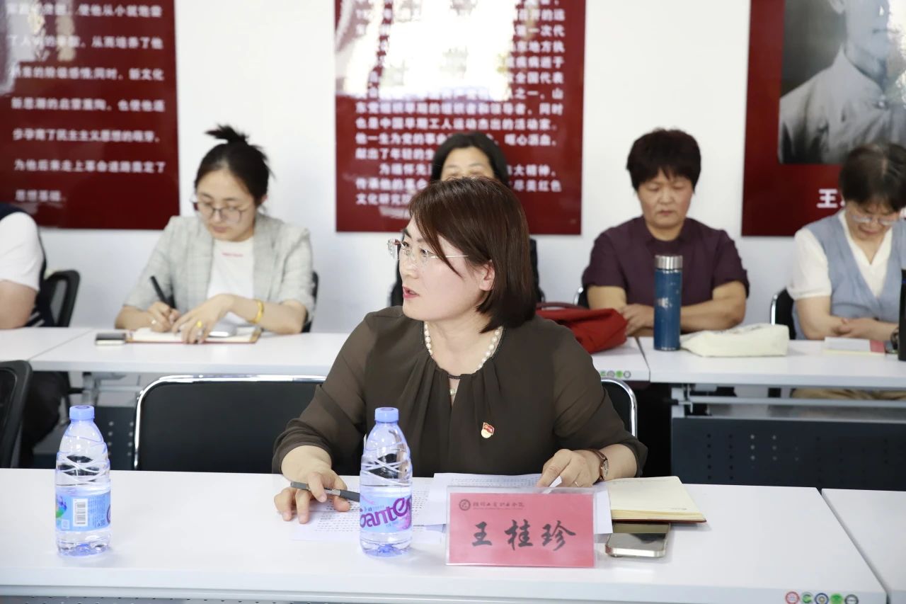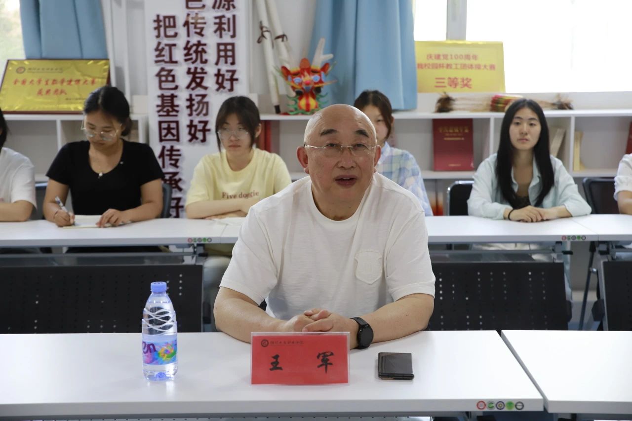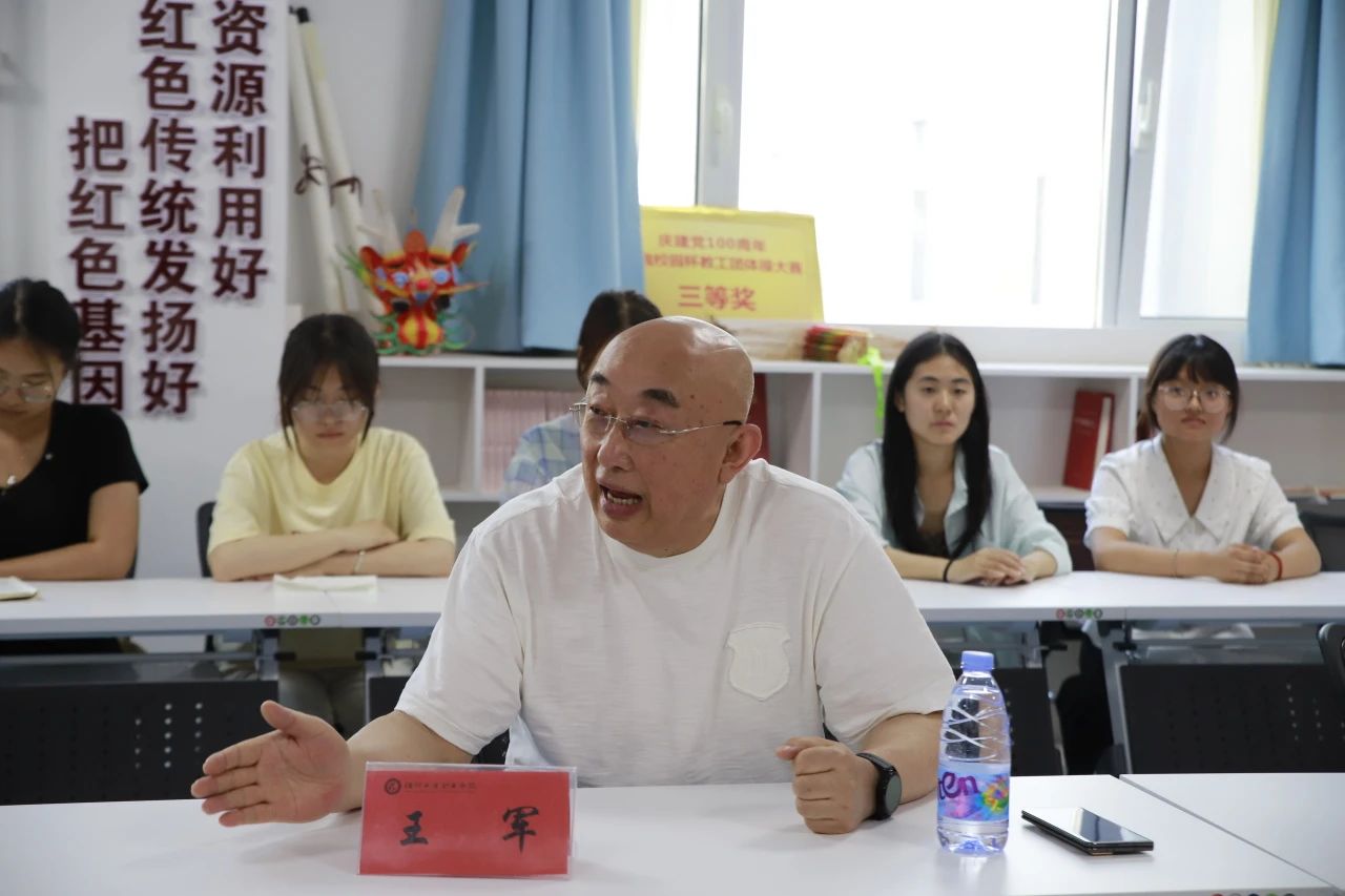座谈会上,马克思主义学院院长王桂珍介绍了学院发展情况。王军对学院工作表示肯定,并深入阐释了“尽善尽美”这一“尽美精神”核心内涵的时代价值。他结合“精忠报国”的家风传承,强调红色基因在当代教育中的重要意义,勉励思政课教师和青年学生加强理论学习、提升思想境界。