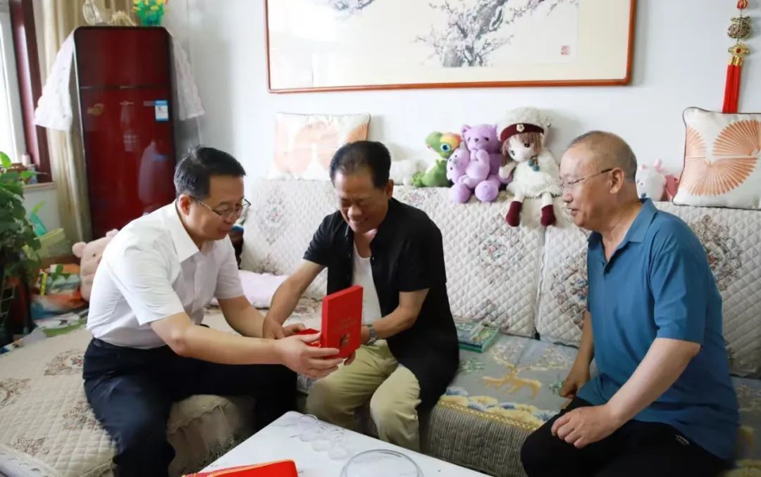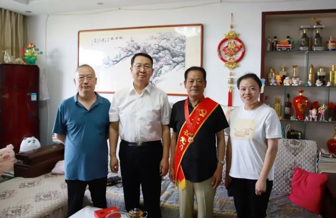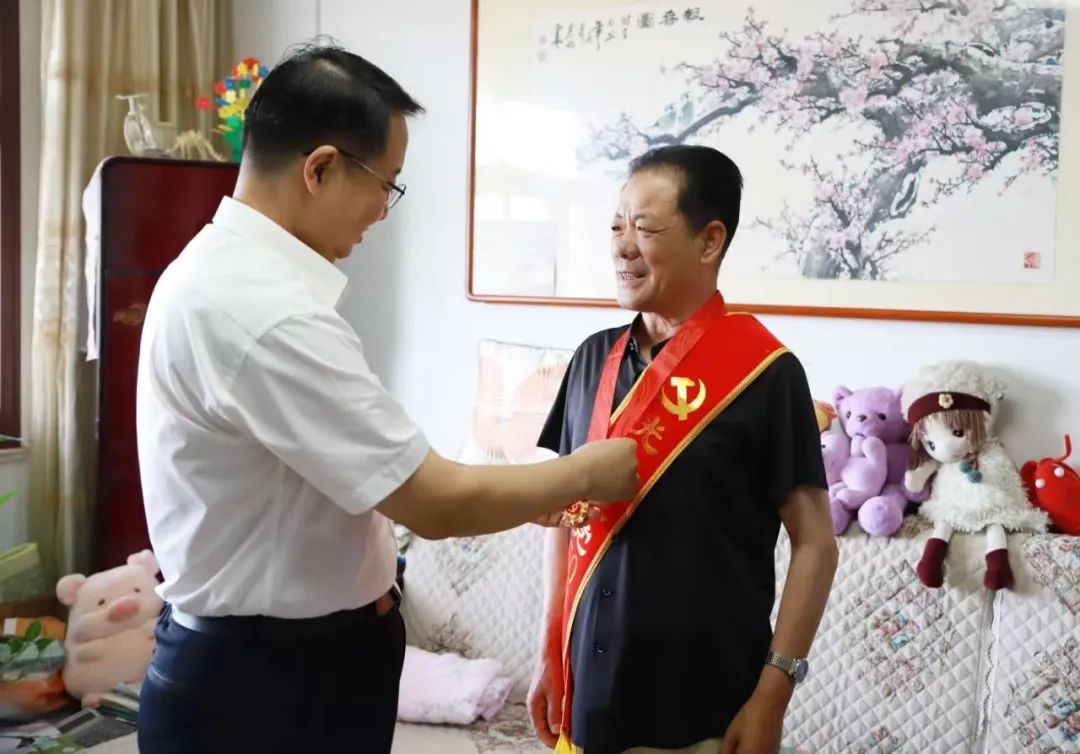 在中国共产党成立104周年之际,6月24日上午,党委书记葛国文带领相关部门负责人,专程上门走访慰问老党员,为党龄满50年的老党员曹洪法同志颁发“光荣在党50年”纪念章,送去党组织的深切关怀与温暖,并向老党员忠诚奉献的崇高精神致以崇高敬意。