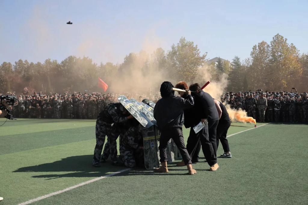 表彰大会上,刺杀操、女子军体拳、男子擒敌拳、战术对抗等军事科目表演动作整齐划一、刚健有力,展示了我校新生良好的形象和精神风貌。