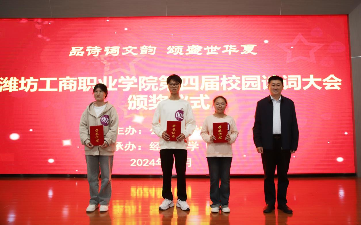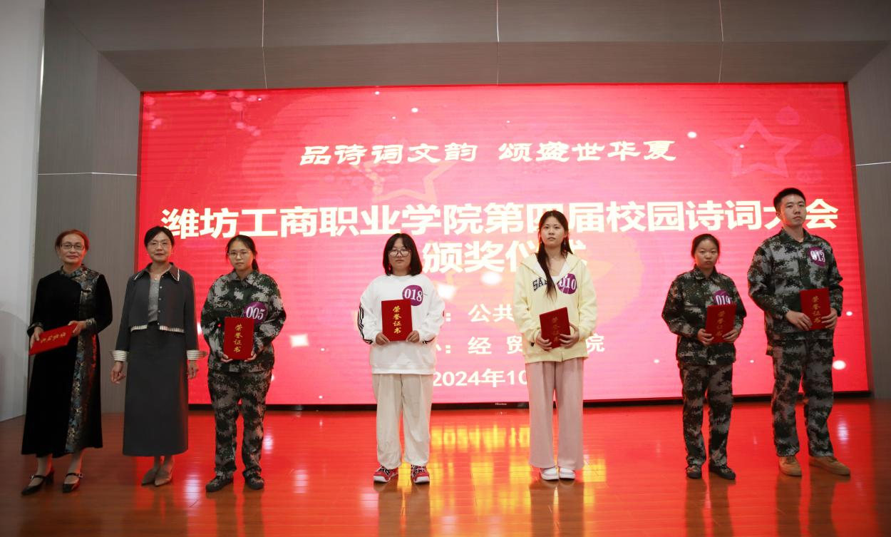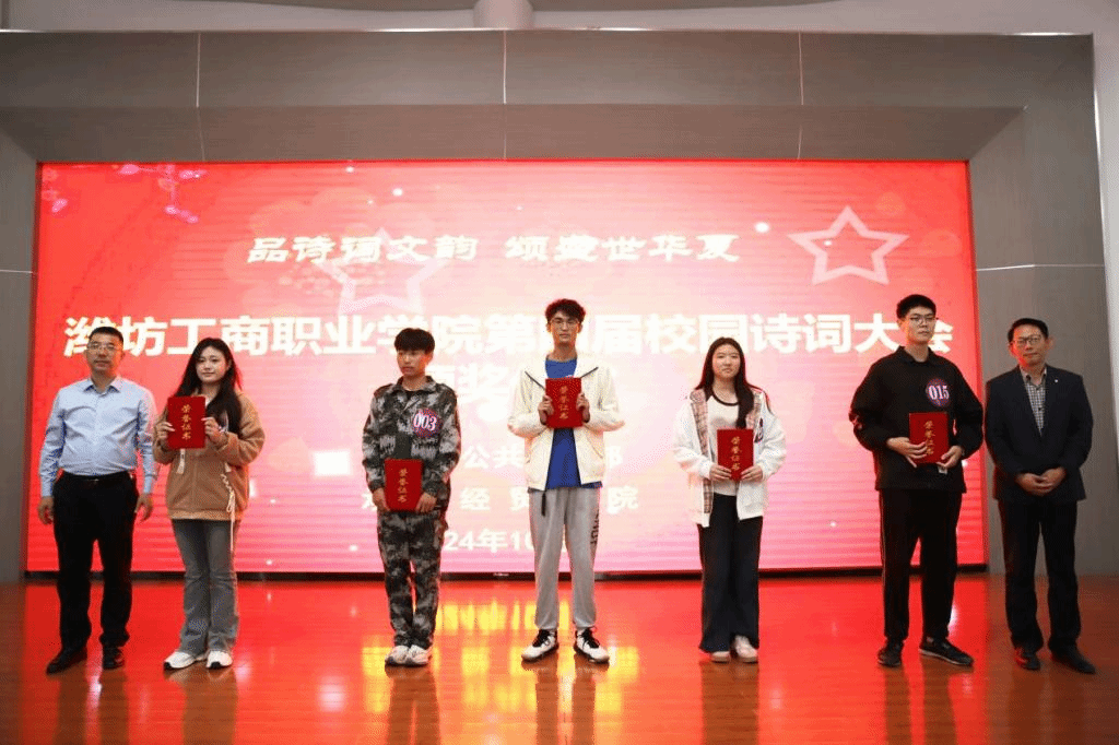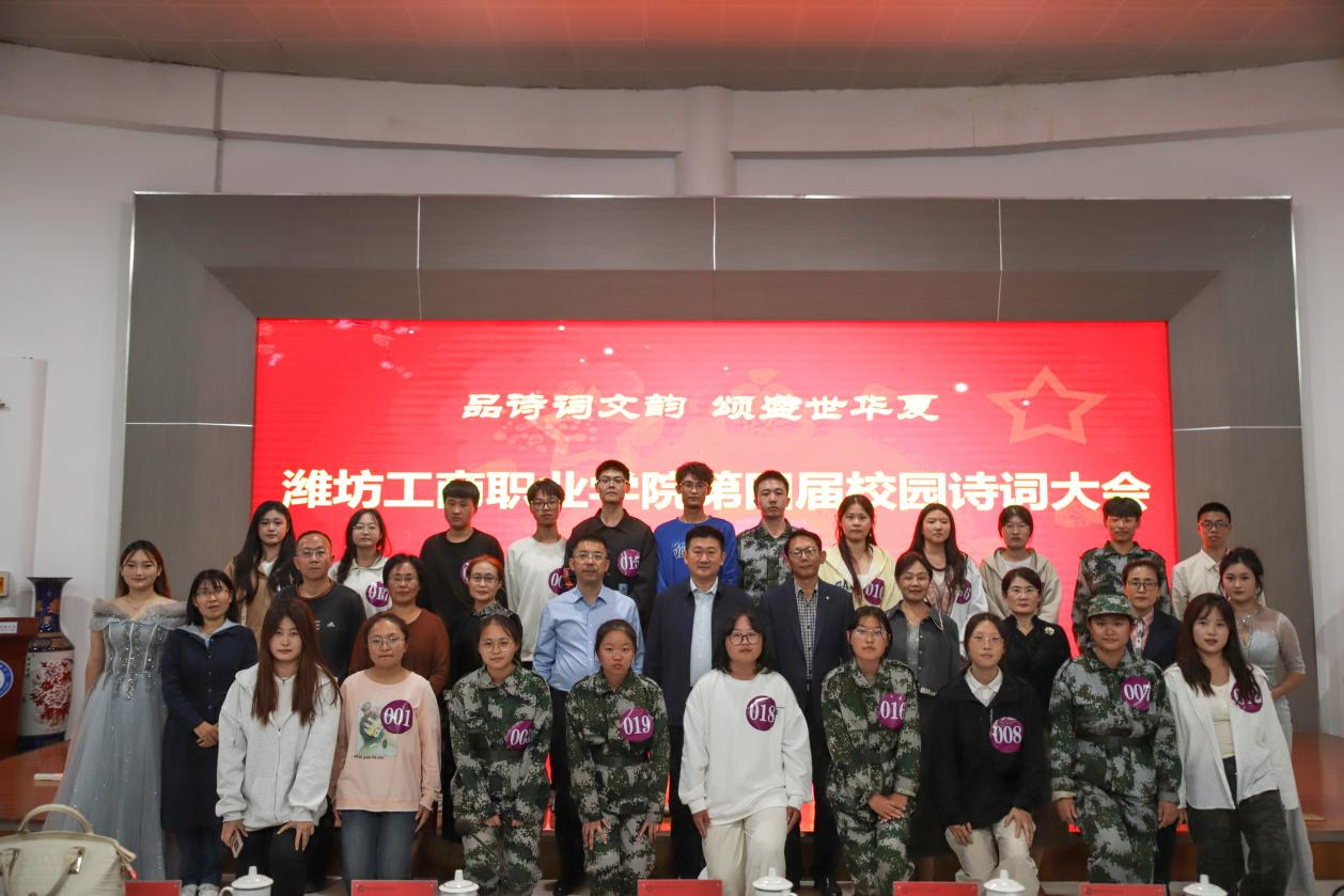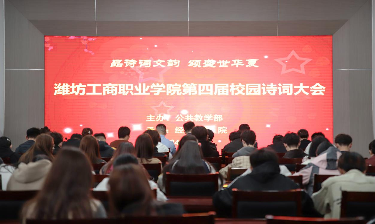 为进一步弘扬传承中华优秀传统文化,潍坊工商职业学院第四届校园诗词大会于10月17日举行,本届大会由公共教学部主办、经贸学院承办。执行校长、党委常务副书记郑志松出席大会。党委委员、校办公室主任杨永,党委委员、宣传统战部部长王树忠,山东省首届优秀诗人范旭梅,我校教授王鹰,副教授曹咏梅担任评委。公共教学部主任王桂珍、经贸学院党总支书记谢瑞凤及部分师生代表参会。