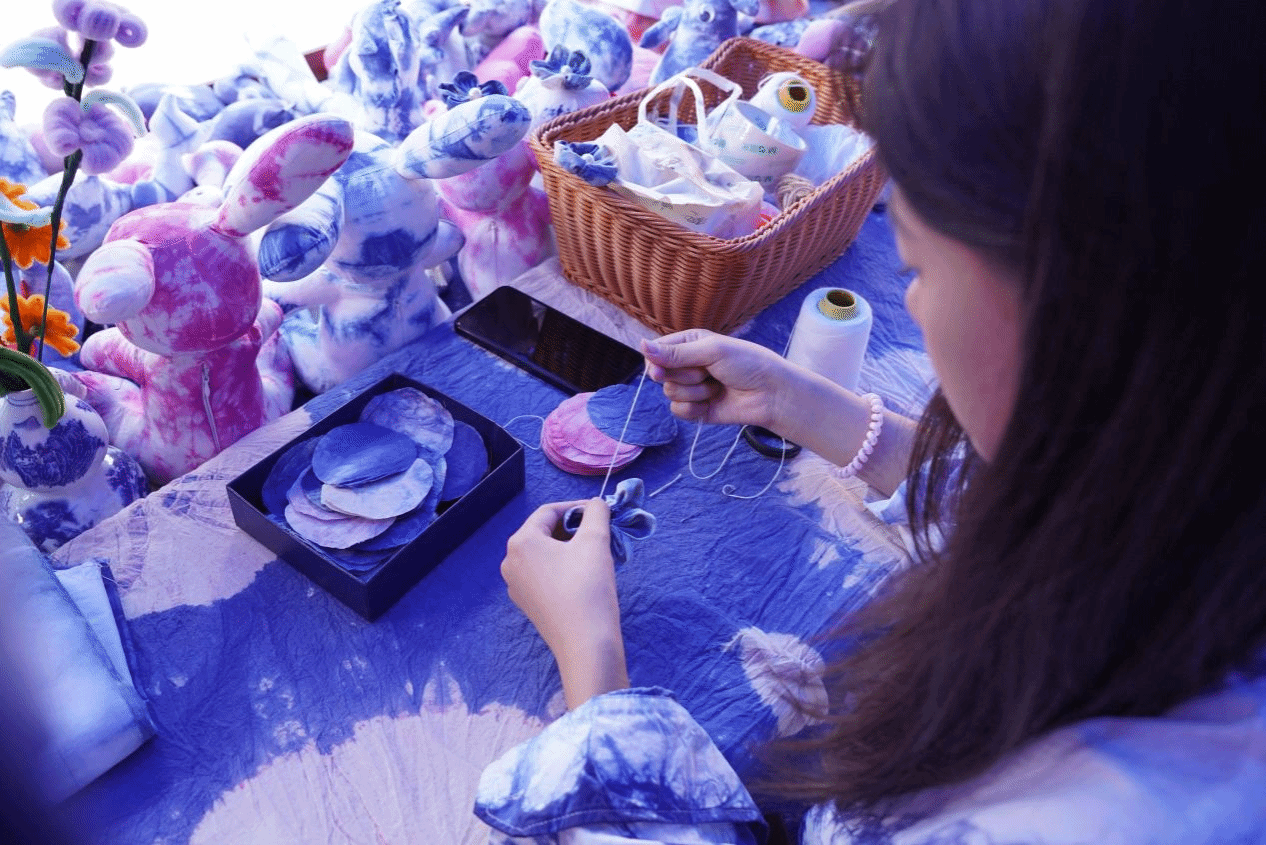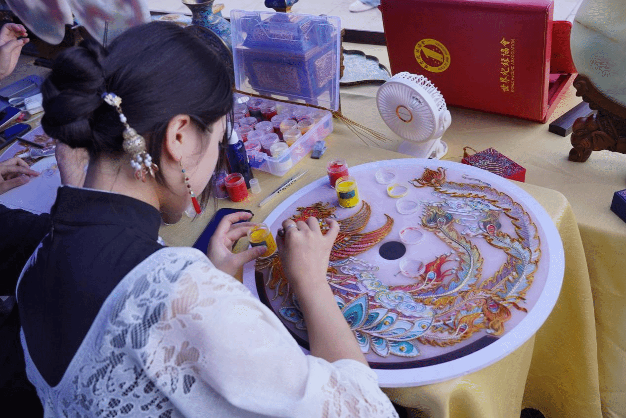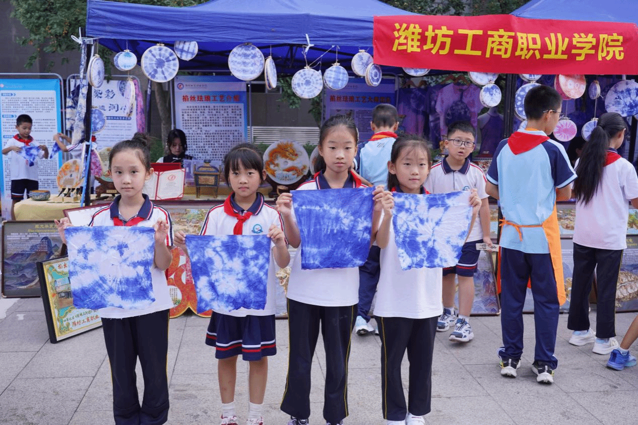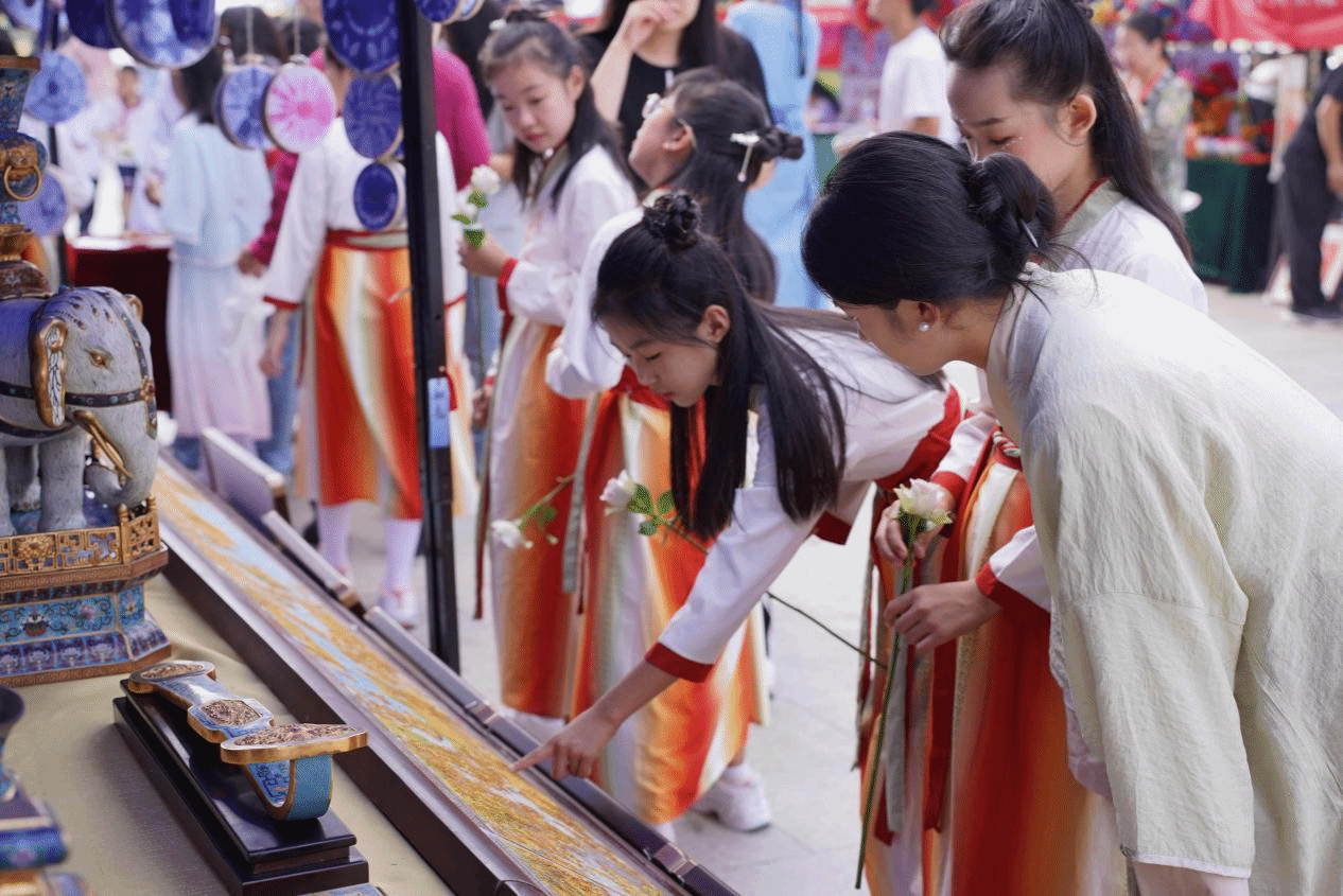 现场还设置了互动体验区,来宾在师生指导下亲手尝试掐丝珐琅、扎染及手工花制作。孩子们在老师帮助下完成了一条条色彩绚丽、图案别致的手绢,每一件都是独一无二的纪念,现场气氛热烈,参与感十足。