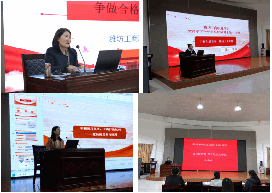 为严格党员发展“入口关”、切实提升党员发展质量,11月3日至5日,潍坊工商职业学院2025年下半年党员发展对象集中培训在学校第二报告厅顺利举办,全校88名下半年党员发展对象全员参训。培训融合专题授课、集中研学、个人自学等多元形式,聚焦筑牢理想信念根基、强化政治理论素养、端正入党思想动机、提升自我建设能力,为发展对象从“思想上入党”夯实基础。