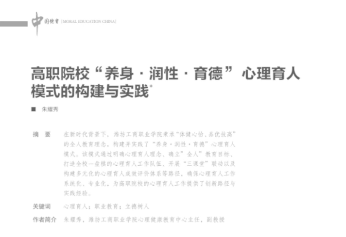 4月6日,潍坊工商职业学院创新构建的“养身·润性·育德”心理育人模式先后在大众网和国家级期刊《中国德育》上刊发,引发教育界广泛关注。