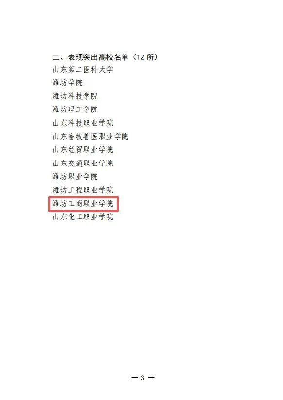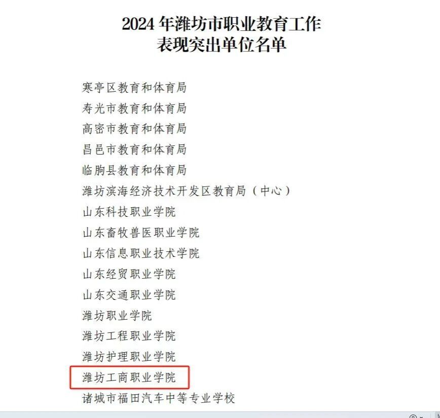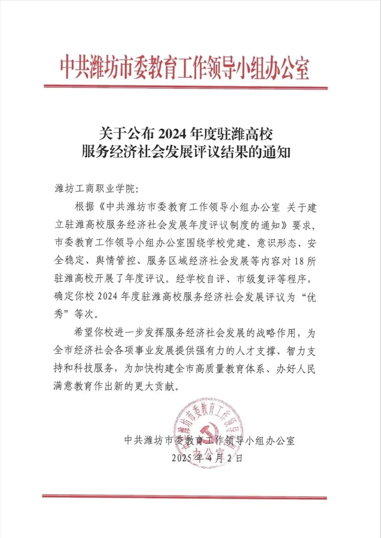 4月2日,潍坊市委教育工作领导小组办公室公布2024年度驻潍高校服务经济社会发展评议结果,潍坊工商职业学院在18所高校中获评“优秀”等次。此外,学校还先后荣获“2024年潍坊市职业教育工作表现突出单位”称号,入选潍坊市校企协同育人工作“表现突出高校名单”。