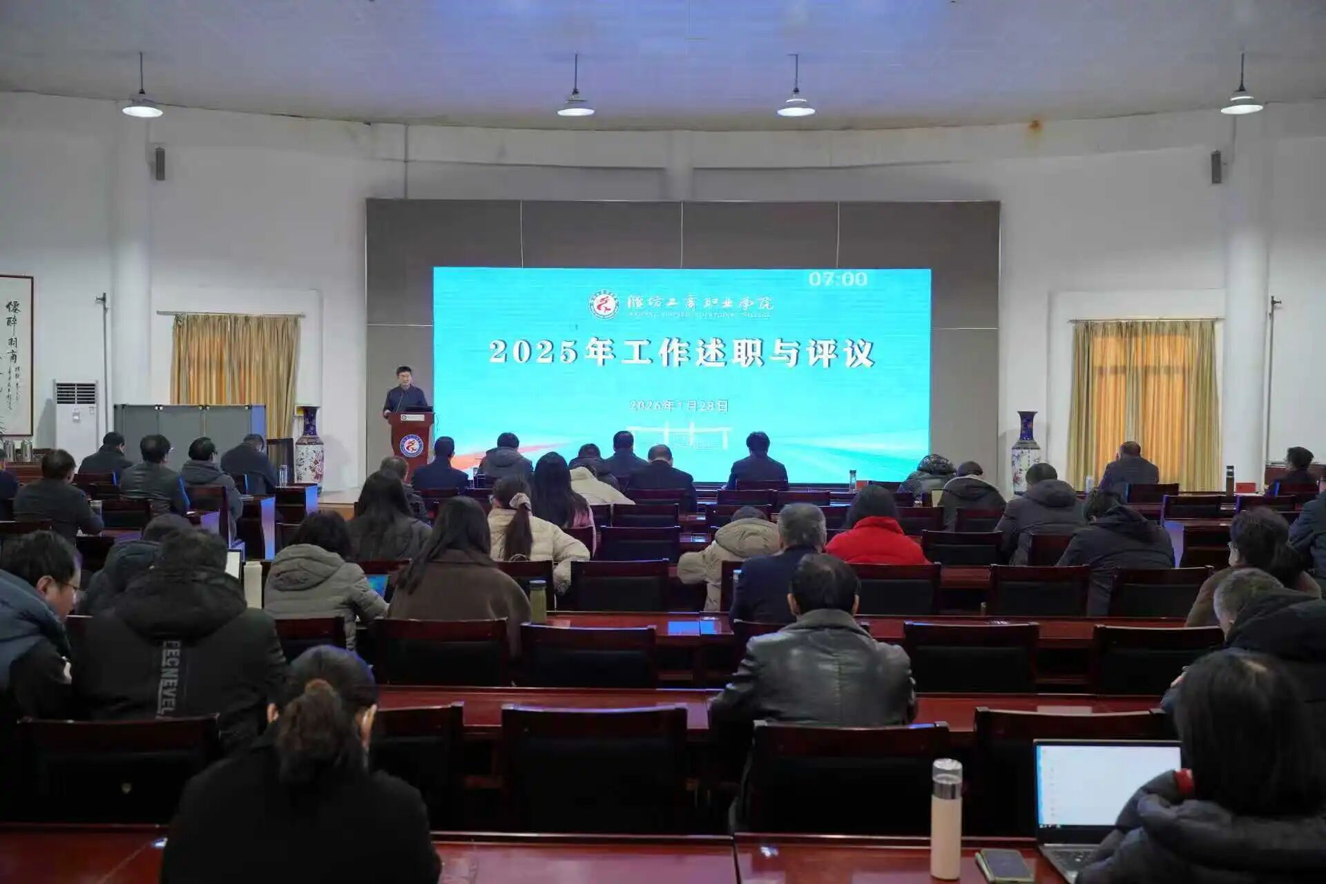 1月28日,学校在第二报告厅召开2025年度工作述职与评议大会。校领导、全体中层干部及教研室主任参加会议,全面回顾过去一年工作,共同谋划新发展。本次大会由党委书记葛国文与党委常务副书记、执行校长郑志松分别主持。
