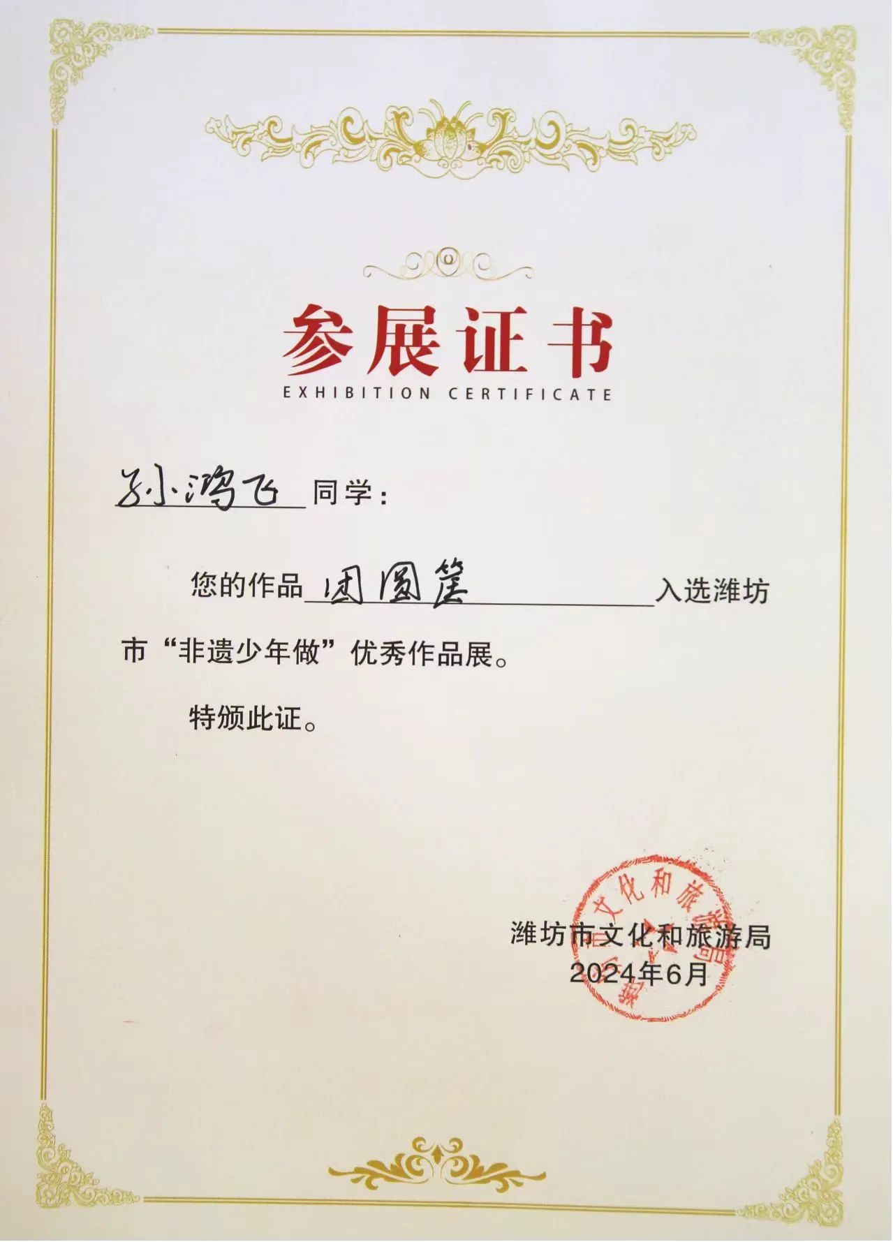 “我88岁的老母亲虽然年龄大了,仍然很喜欢动手编织作品,我的儿子孙键、孙子孙鸿飞都跟着学会了柳草编技艺。柳草编丰富了我的家庭生活,让我们几代人体会到获得感、成就感!”,孙老师笑着跟我们分享。在孙老师的家中,我们看到了祖孙几代在一起编制柳草编作品的画面和获奖证书。作为孙老师的孙子,孙鸿飞编制的“团圆筐”入选潍坊市“非遗少年做”优秀作品展,潍坊市文旅局为他颁发了证书。孙老师在学校的时候,利用课余时间成立柳草编技能小组,培养了孙铭超、刘伟、王海东等一批编织小能人。每周末有空,孙老师都带着作品去诸城蔡家沟艺术村赶“非遗大集”,每当作品被人们团团围住,驻足欣赏,他总是感觉到心满意足。