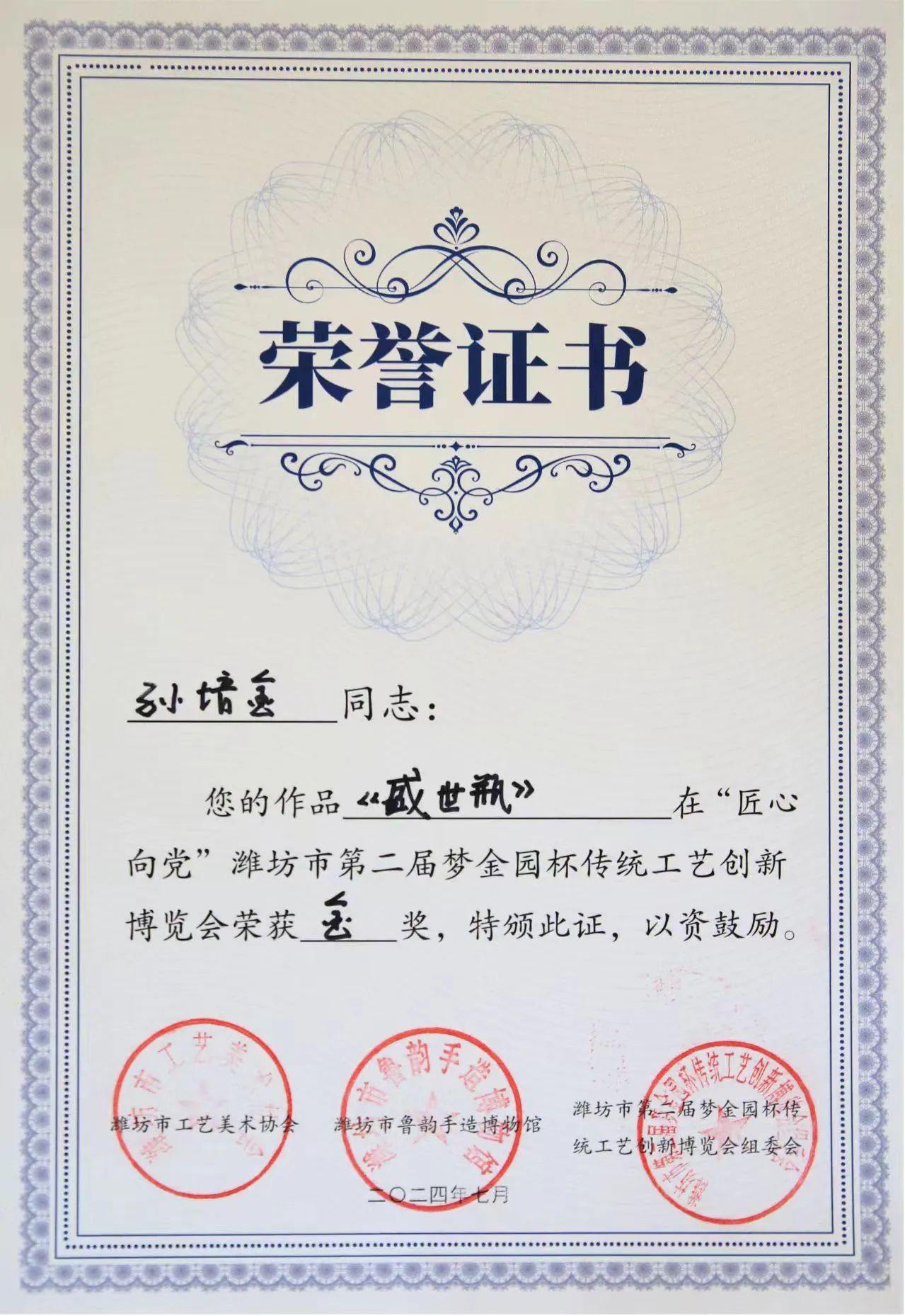 盛夏时节,从2024年“匠心向党”潍坊市第二届梦金园杯传统工艺创新博览会上传来喜讯,我校教师孙培金的柳编作品“盛世瓶”荣获“金奖”。