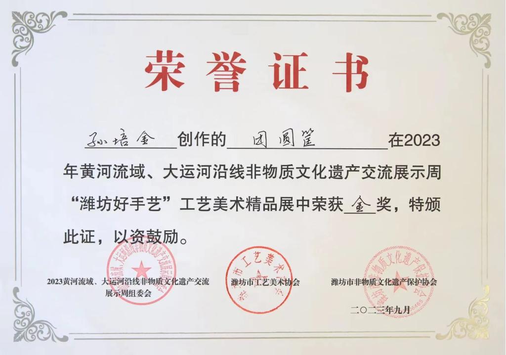 “今后,还要在原来的基础上,在造型和技法上继续加以创新,将中华民族的优秀文化更好的传承下去”, 孙培金表示。他的柳草编作品还在2023年黄河流域、大运河沿线非物质文化展示周“潍坊好手艺”工艺美术精品展中荣获“金奖”,其本人是潍坊市非物质文化遗产保护协会会员,潍坊市工艺美术协会会员。