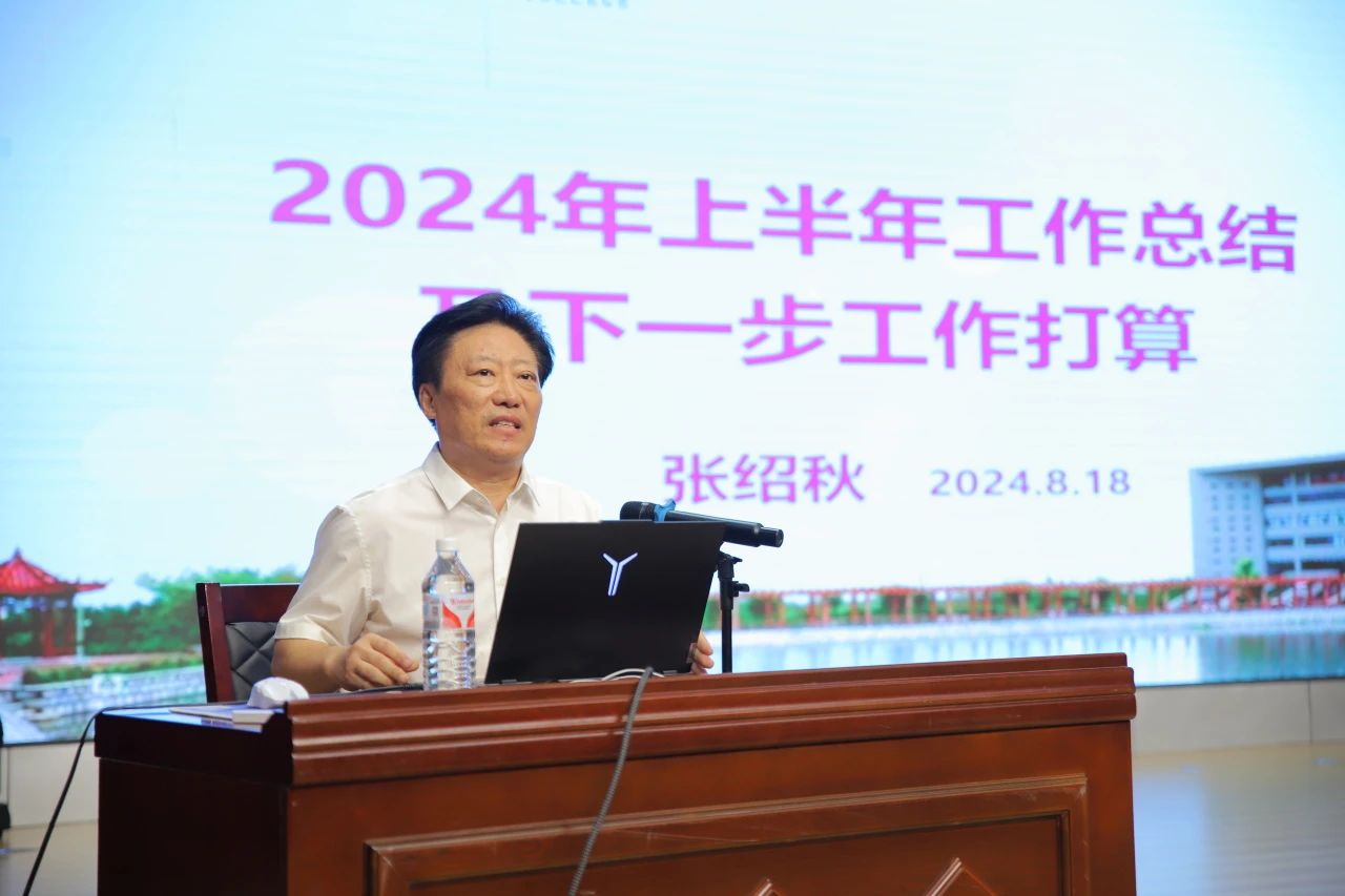 校长张绍秋总结了上半年学校在党建思政、专业建设、科研工作、师资队伍建设等方面取得的成绩和不足。并强调了下半年重点工作包括招生就业、迎新准备、开学培训等,强调加大内涵建设,突出校企共建特色,提升创新和规范化办学能力。