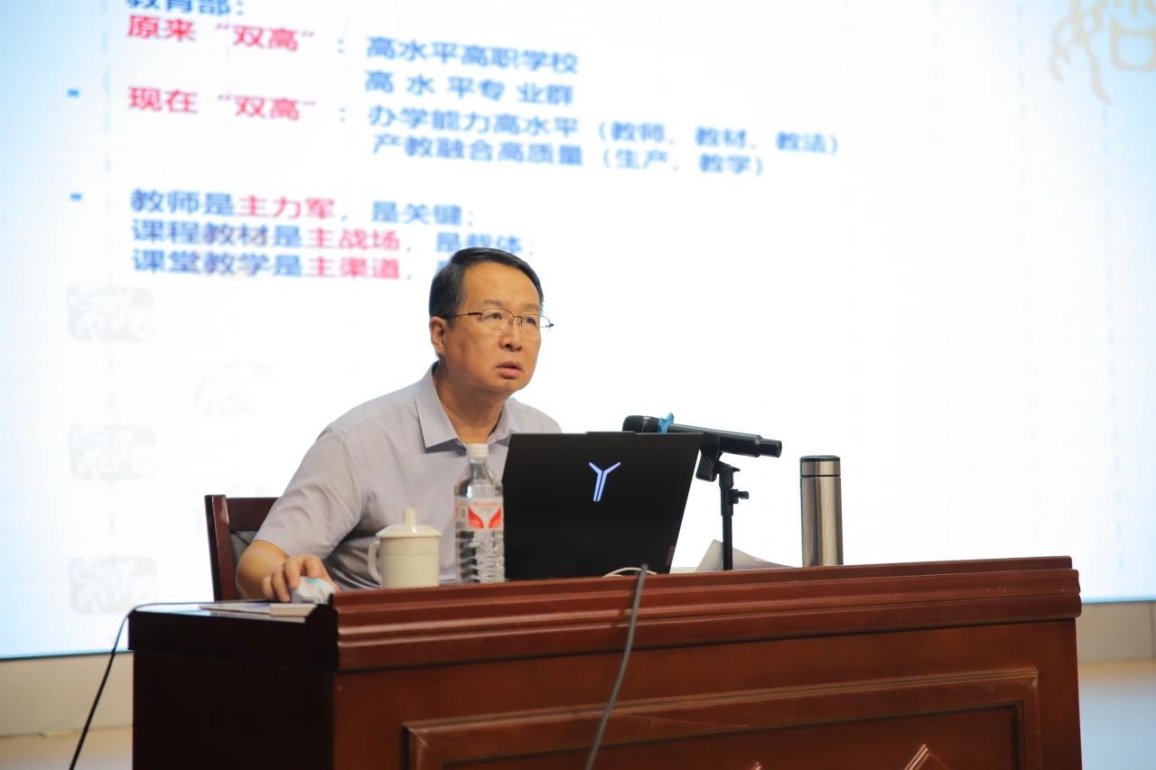 副校长郑明言作《高质量发展视野下加快推进“五金”新基建》主题报告。提出以"一体两翼五重点"框架优化职业教育,强化产教融合,加快"五金"新基建(金专业、金课程、金教材、金师资、金实训基地)。