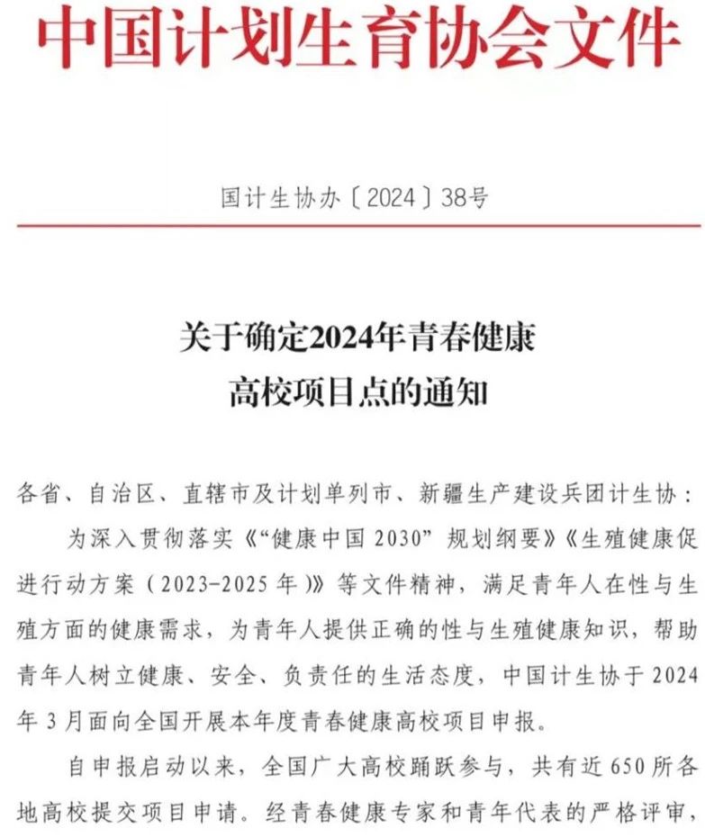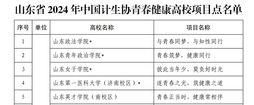 近日,中国中国计生协公布了2024年青春健康高校项目中标高校名单。我校心理健康教育中心申报的项目“以健康之心,护青春之行”成功中标,成为获得中国计生协项目经费支持的十所山东高校之一。这是我校第五次中标该项目。