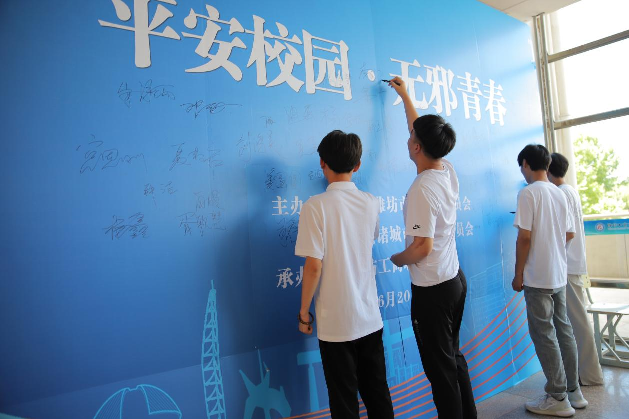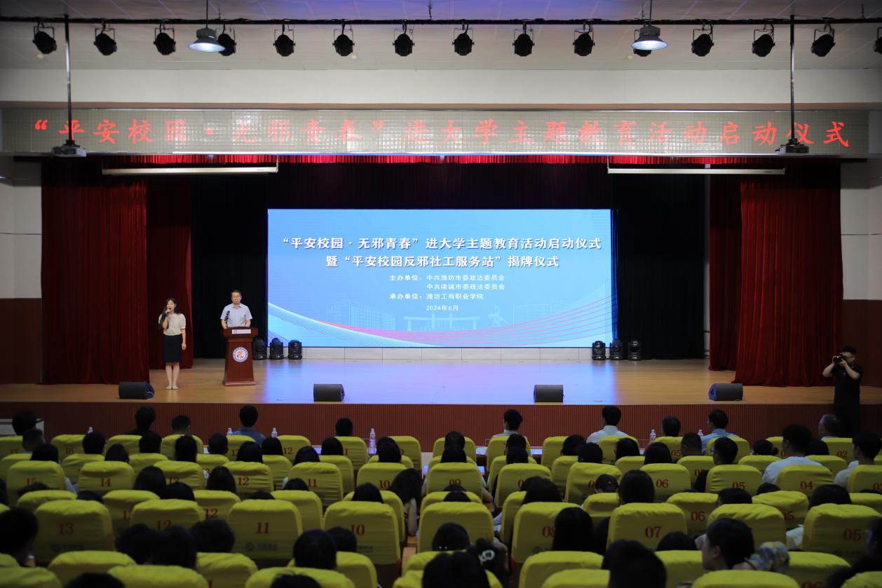 6月20日上午,我校承办了“平安校园·无邪青春”进大学主题教育活动启动仪式暨“平安校园反邪社工服务站”揭牌仪式。本次活动由中共潍坊市委政法委员会、中共诸城市委政法委员会主办。潍坊市委政法委副书记郭璐,潍坊市法学会党组成员、专职副会长兼秘书长夏寿岩,诸城市委常委、政法委书记李振华,诸城市委政法委、组织部、宣传部、统战部、社工部、教体局、公安局等22个部门分管领导出席仪式。我校校长张绍秋,以及师生代表600余人参加活动。仪式由我校党委书记葛国文主持。