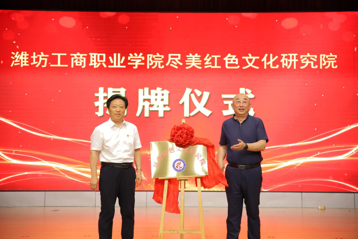 随后举行了潍坊工商职业学院“尽美红色文化研究院”的揭牌仪式,由张绍秋校长与王军会长共同揭幕。研究院的成立标志着学校在红色文化研究和传承方面迈出了坚实的步伐。