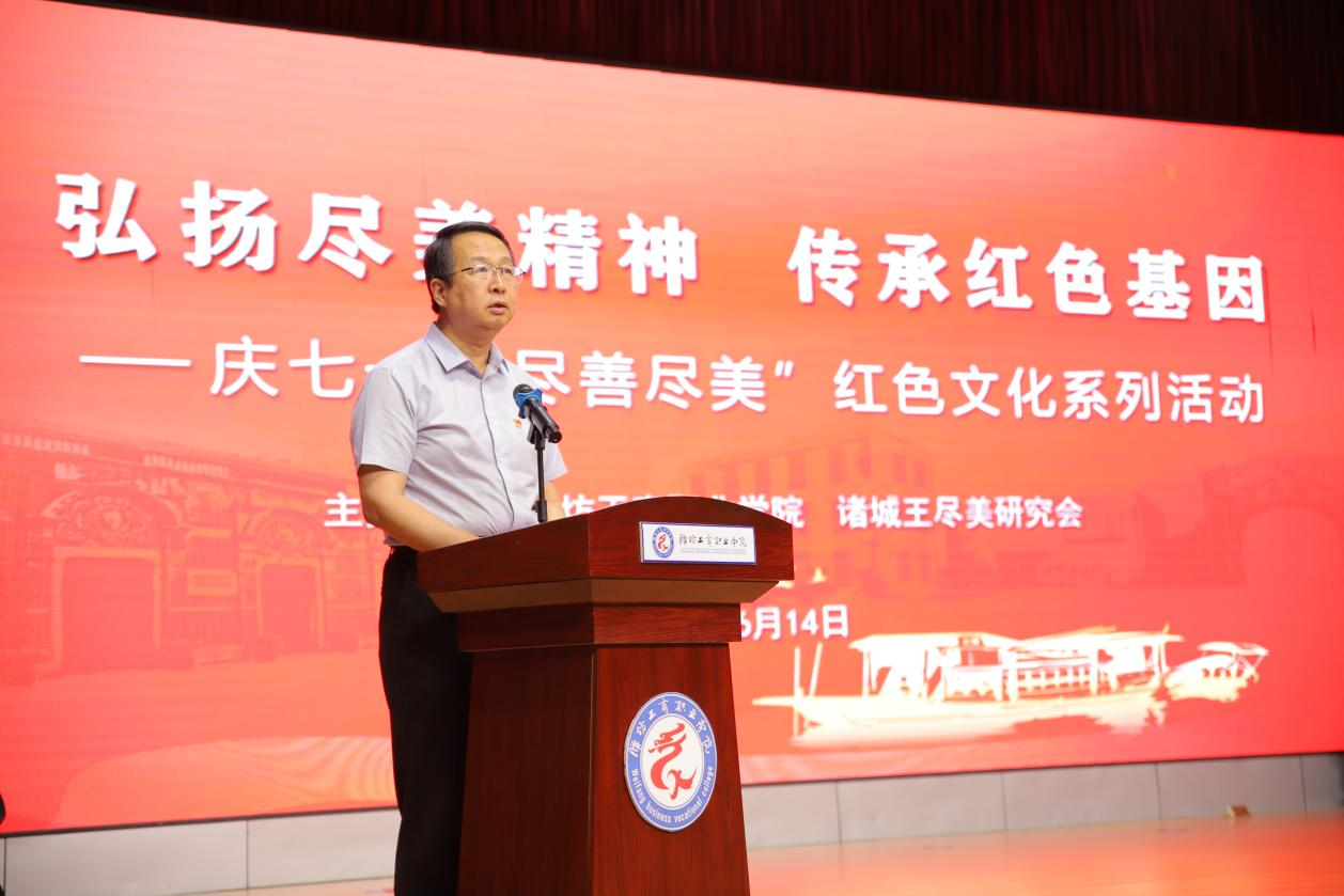 6月14日,“弘扬尽美精神,传承红色基因----庆七一‘尽善尽美’红色文化系列活动”在我校举行。清华大学马克思主义学院原副院长、教授、博导、诸城王尽美研究会会长韩冬雪,王尽美孙女、第二军医大学长征医院教授王爱华,王尽美嫡孙、诸城王尽美研究会副会长王军,研究会特邀学术研究指导专家,第三届诸城王尽美研究会理事会成员及会员,有关王尽美研究的基地、场馆、院校代表,校长张绍秋,党委书记葛国文以及师生代表600余人参加了活动。党委常务副书记、执行校长郑志松主持。