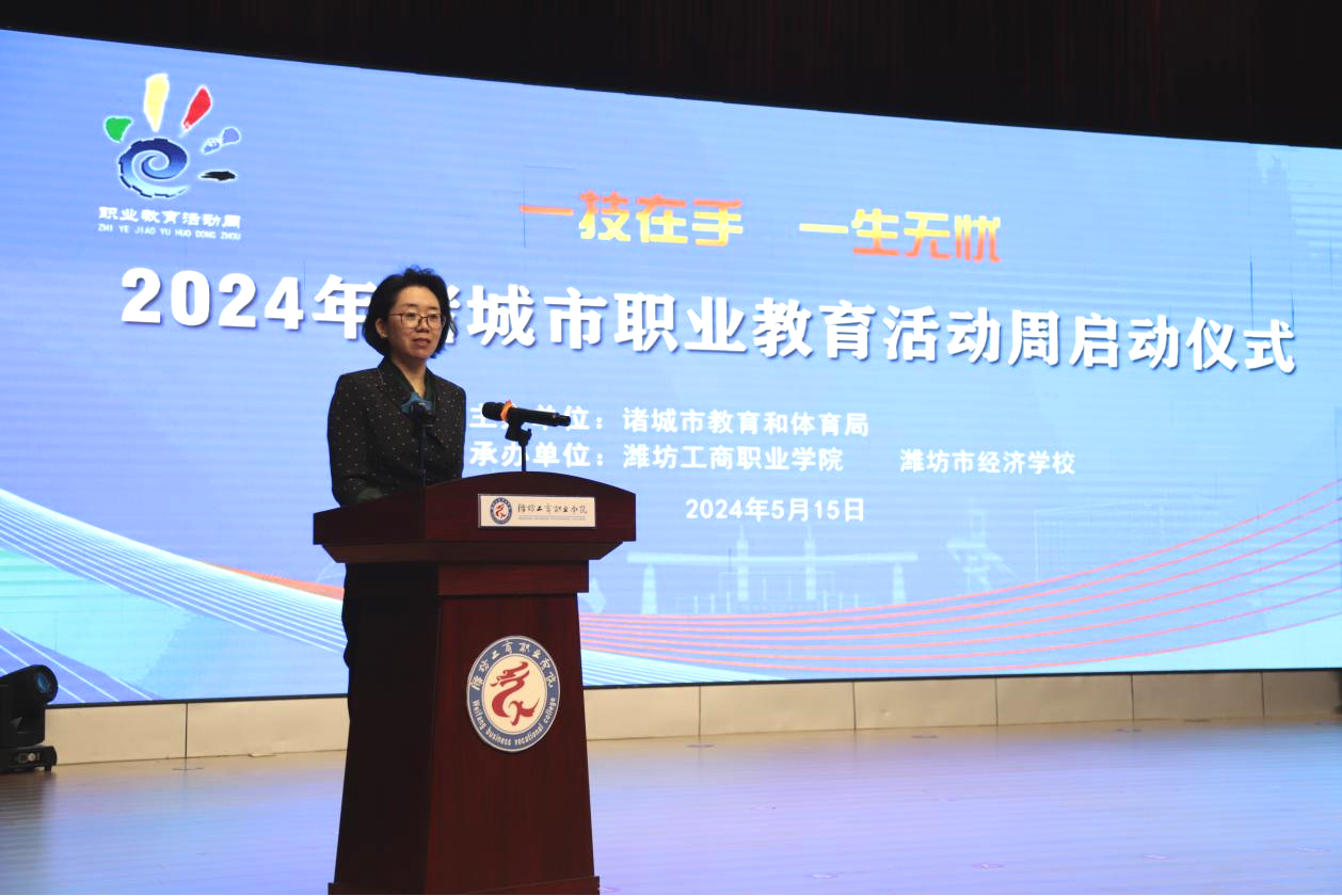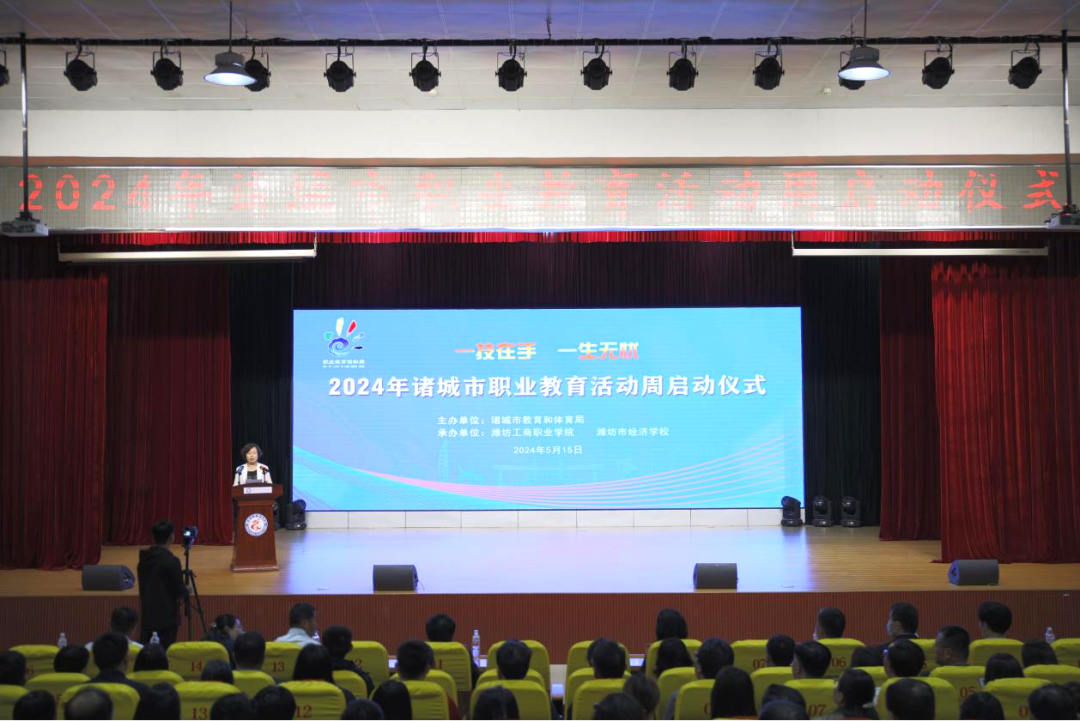 5月15日,以“一技在手,一生无忧”为主题的2024年诸城市职业教育活动周启动仪式在我校第一报告厅举行。潍坊市教育局领导,诸城市领导,高新园分管负责人,宣传部、网信办、团市委、总工会、教体局、财政局(国有资产)、人社局、工信局、农业农村局、中华职教社等活动周成员单位分管负责人,我校领导班子成员、二级学院及部门负责人、二级学院师生代表参加,仪式由诸城市委教育工委委员王泽琪主持。