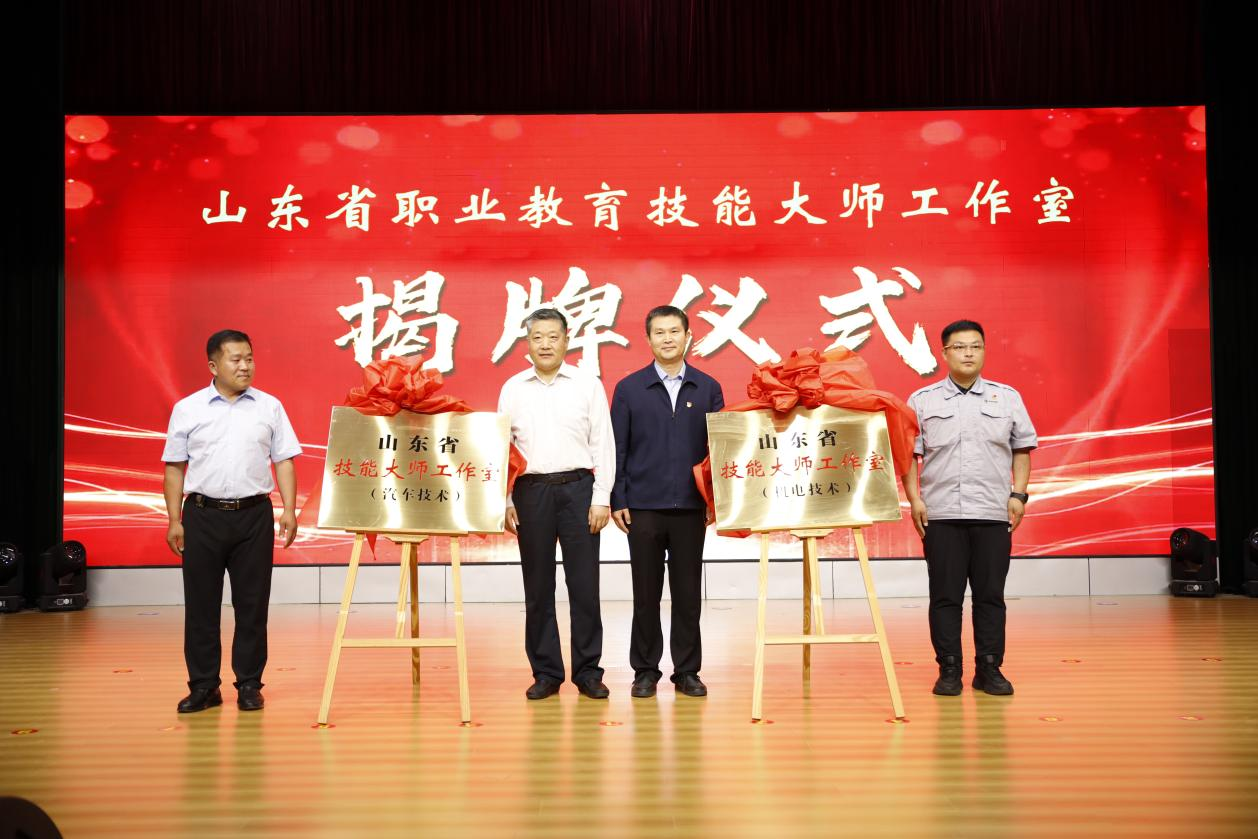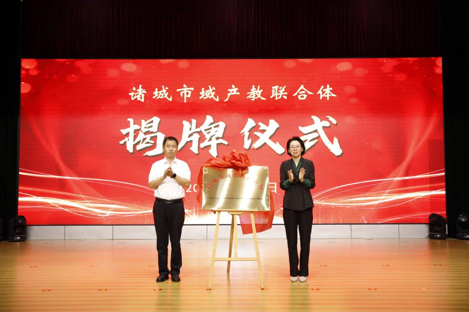 大会进行了揭牌仪式。潍坊市教育局党组副书记、市委教育工委副书记王妍妮和诸城市委常委、宣传部部长、市委教育工委书记、市总工会主席刁立武共同为诸城市域产教联合体揭牌;俄罗斯自然科学院外籍院士陈清奎和我校校长张绍秋共同为潍坊工商职业学院院士工作站揭牌;潍坊市教育局四级主任科员方斌和诸城市教体局党组书记、局长,市委教育工委常务副书记孙加军共同为王浩名和孙秀平两个山东省职业教育技能大师工作室揭牌。