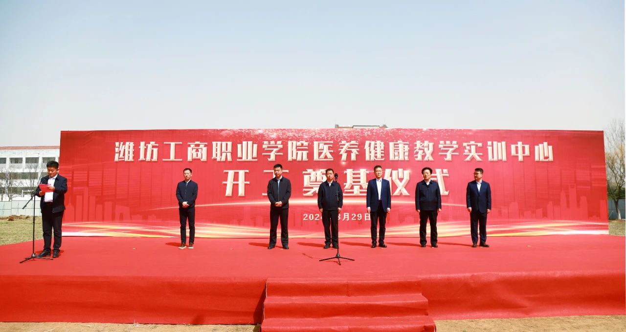 3月29日上午,我校山东省高水平专业群医养健康教学实训中心建设项目正式开工,这是我校落实国家和省市职业教育政策部署,改善办学条件,加强技能教学,提升人才培养质量的一项重要举措。诸城市委常委、宣传部长、教育工委书记刁立武,启辰控股集团董事长、潍坊工商职业学院董事长郑明高,青建国际集团副总裁赵凯,我校校长张绍秋,启辰控股集团后勤产业集团董事长董卿,以及教体局相关领导、我校领导班子成员、建设施工单位的有关同志和学校部分师生代表出席了仪式。本次开工仪式由我校执行校长、党委常务副书记郑志松主持。
