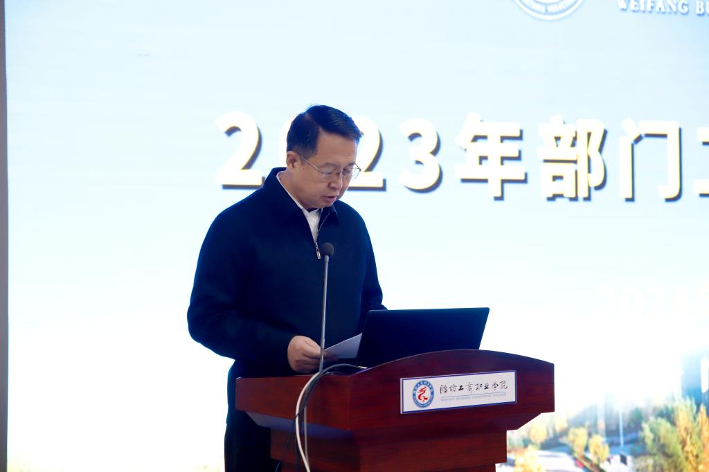 校长张绍秋对中层干部述职情况进行总结点评,他指出,2023年我校取得较好的成绩, 党建引领更加有力,内涵建设成果丰硕,产教融合日趋紧密,长效机制更加完善,办学条件逐步改善,学校美誉度、品牌知名度再度提升,这些成绩的取得,与各位的付出分不开,向各位表示衷心的感谢,但也要清醒认识面临的切身问题,形势依然严峻,有机遇,有挑战,机遇大于挑战。最后,张校长凝练地阐述了2024年工作思路并指明了近期工作要点,督促各部门利用假期复盘2023年工作状况,找好发力点,找出部门优势、劣势,明确2024年工作思路,做好新学年工作安排。
