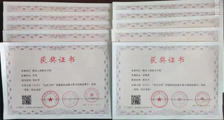 智能制造技能大赛初赛于2023年6月举行,在全国海选赛中,我校智能信息学院有14名同学参加,取得了10个二等奖的好成绩。