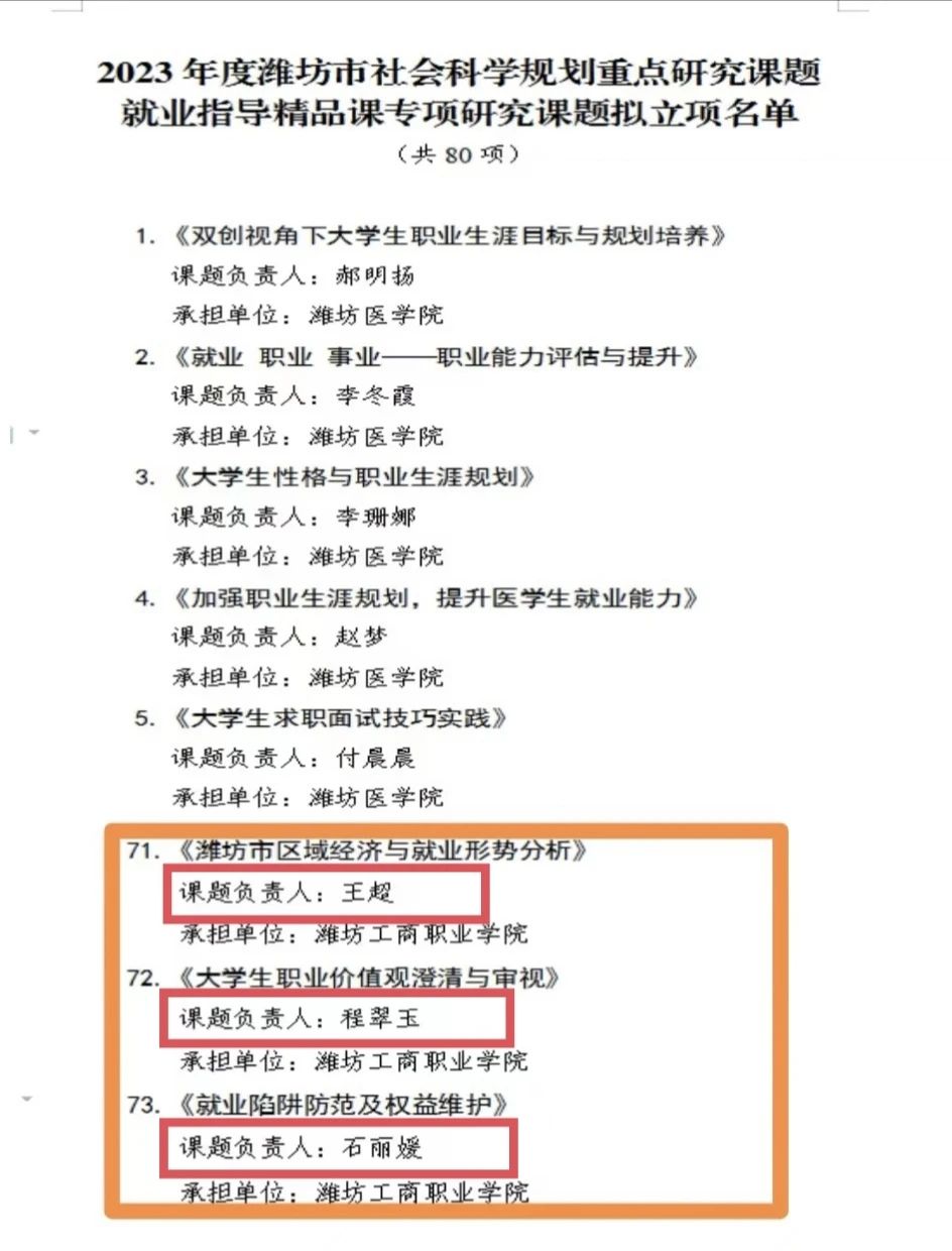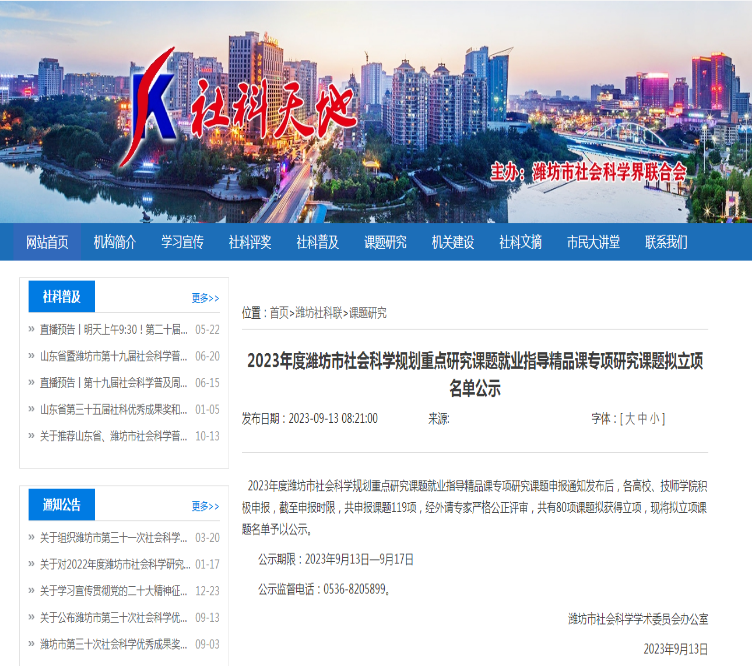 2023年9月13日,潍坊社科联公布了2023年度潍坊市社会科学规划重点研究课题就业指导精品课专项研究课题拟立项名单,经外请专家严格公正评审,共有80项课题拟获得立项。