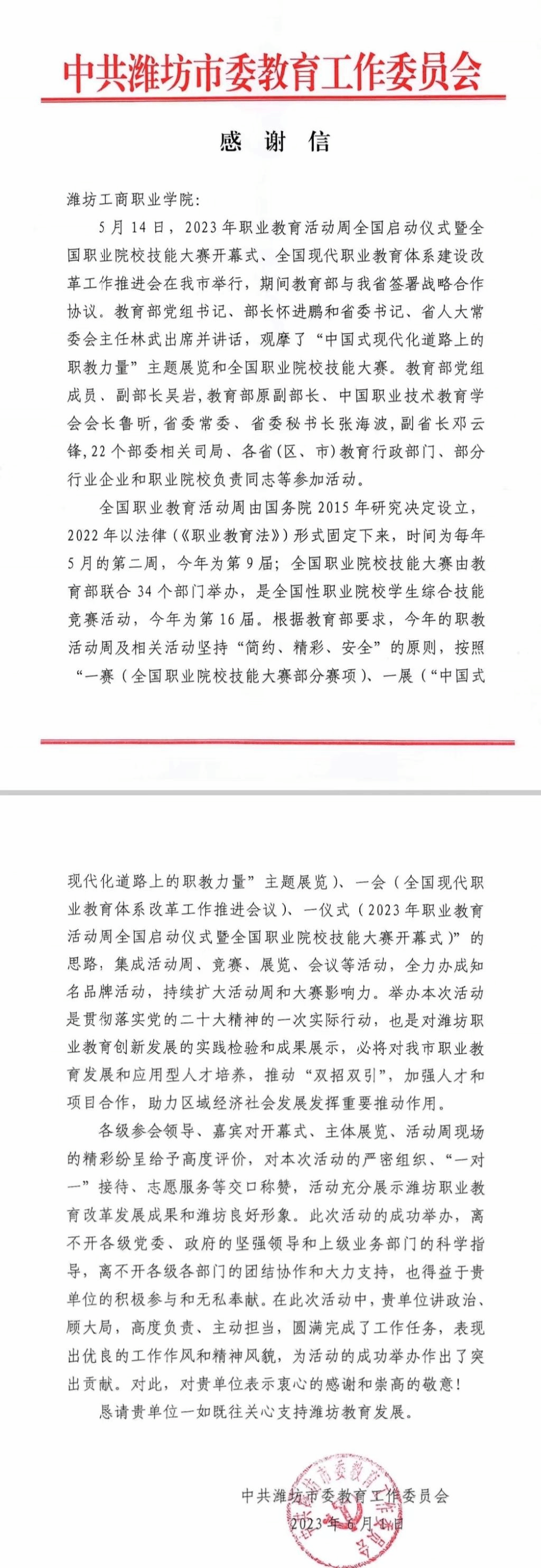 6月,金穗飘香,麦浪翻滚。学校收到潍坊市委教育工委发来的感谢信:“……贵单位讲政治、顾大局,高度负责,主动担当,圆满完成了工作任务,表现出优良的工作作风和精神风貌,为活动的成功举办作出了突出贡献。对此,对贵单位表示衷心的感谢和崇高的敬意!……”