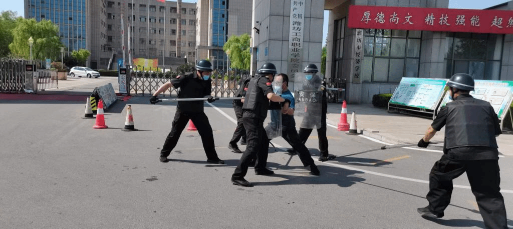 为强化对校园暴力事件的有效控制, 5月18日上午9:00,潍坊工商职业学院、潍坊市经济学校与诸城市朱解派出所联合进行反恐防暴演练。根据学校制定的反恐防暴预案,安保部门组织实施演练,从快速果断制服强闯校园大门口的不法人员到接到巡逻队员报警迅速出警抓捕不法人员。整个演练过程体现出反恐防暴的实战性和针对性。