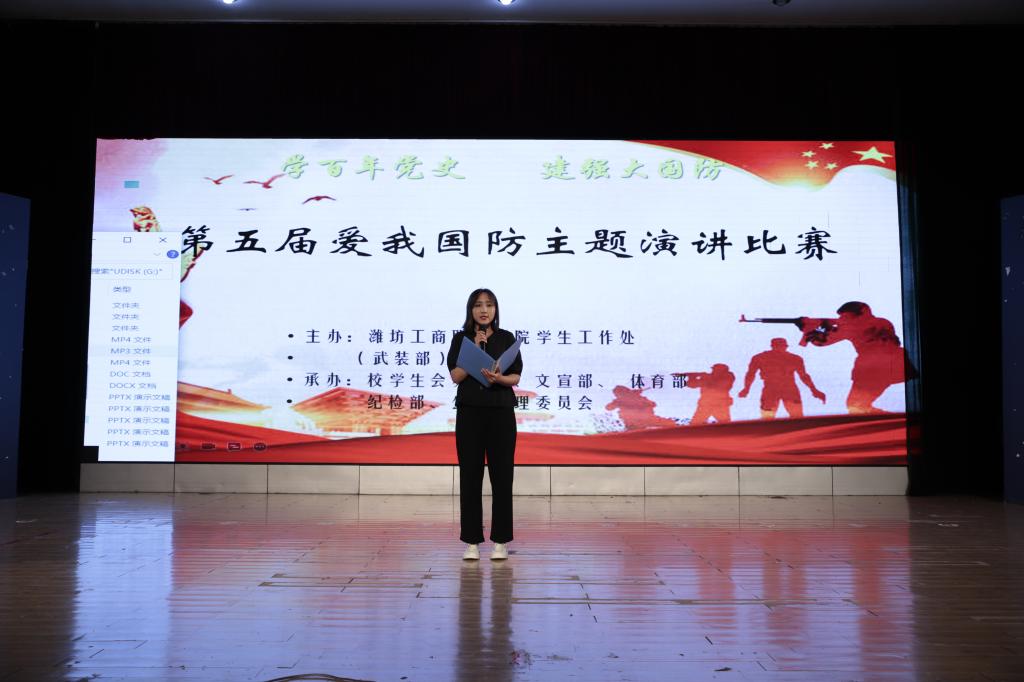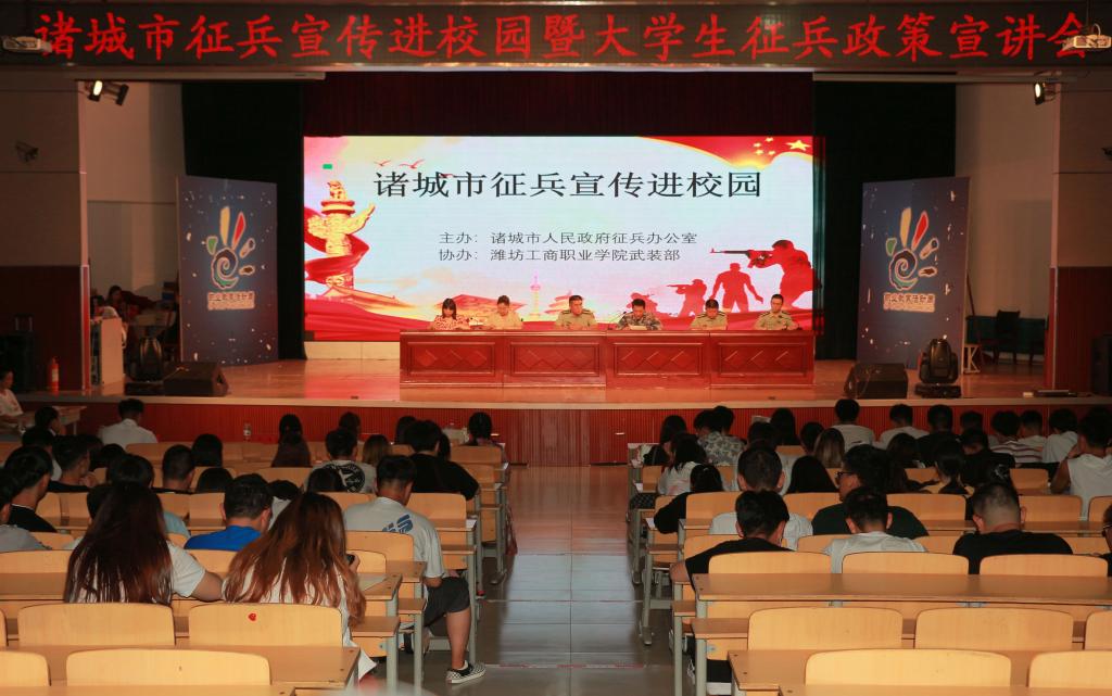 6月24日, 为深入推动今年征兵工作,广泛宣传征兵常识政策,进一步激发有志青年参军报国热情,“2021年诸城市征兵宣传进校园暨爱我国防主题演讲比赛校赛”在潍坊工商职业学院第一报告厅举行。本次活动由诸城市人民政府征兵办公室、诸城市人民武装部、潍坊工商职业学院武装部三方共同主办。