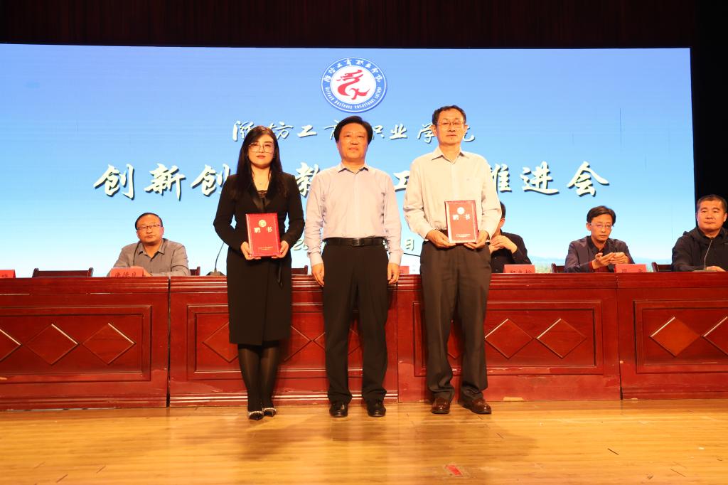 第二项由学校校委会主任张绍秋同志为高延鹏教授、宋晓晓校长颁发聘书。经学校校委会研究,决定聘任高延鹏教授为我校创新创业教育学院名誉院长和创新创业导师;聘任宋晓晓同志为我校创新创业教育学院创新创业导师。