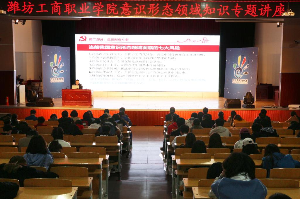 第一阶段进行潍坊工商职业学院意识形态领域知识专题讲座。由诸城市公安局国内安全保卫大队中队长刘德宝同志从“什么是意识形态、意识形态斗争、如何做好意识形态领域工作”三方面进行讲解。此次讲座是为了进一步加强和改进意识形态工作,落实党管意识形态原则,牢牢掌握意识形态工作的领导权、管理权和话语权,坚决做到党在高校意识形态领域的主导权。