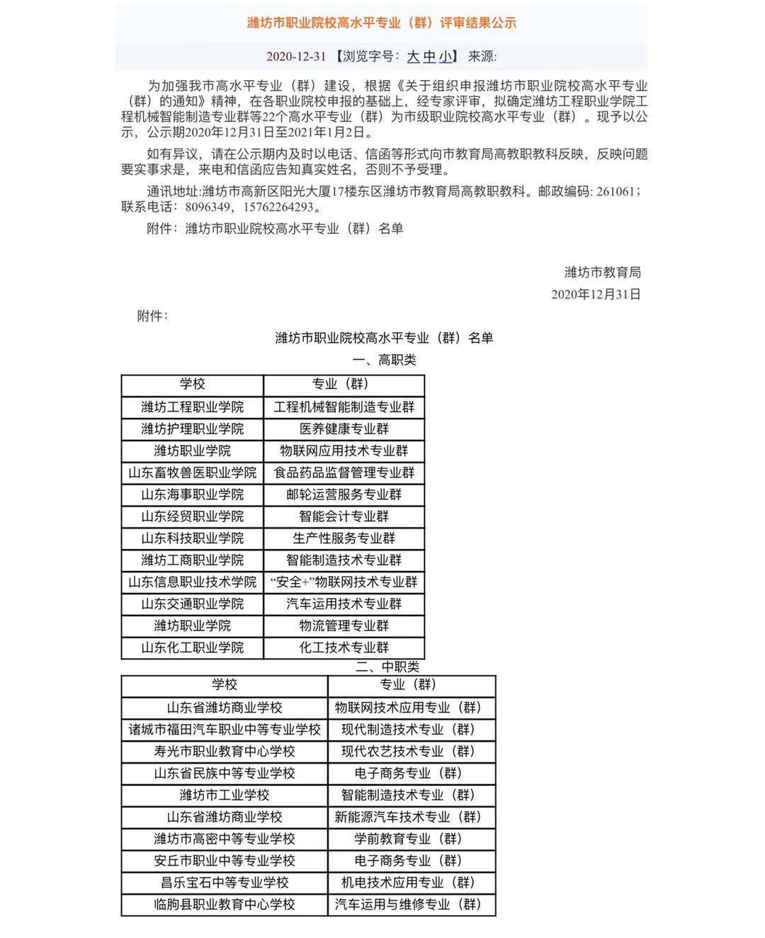 近日,潍坊市教育局发布了《潍坊市职业院校高水平专业(群)评审结果公示》,我校机电与汽车工程学院申报的智能制造技术专业群成功入选。