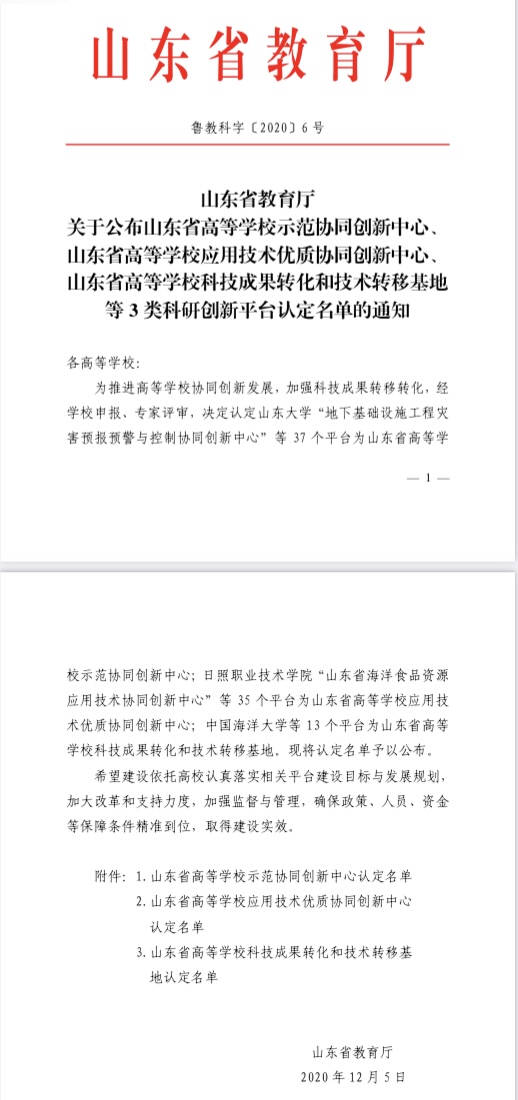 近日,山东省教育厅发布了《关于公布山东省高等学校示范协同创新中心、山东省高等学校应用技术优质协同创新中心、山东省高等学校科技成果转化和技术转移基地等3类科研创新平台认定名单的通知》,我校机电与汽车工程学院申报的《无废城市绿色环保装备智能制造技术协同创新中心 》光荣上榜。