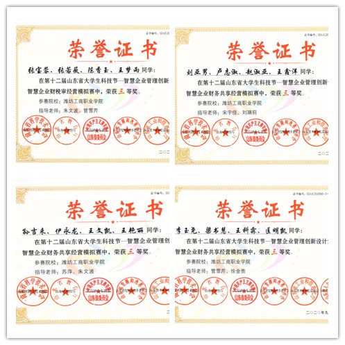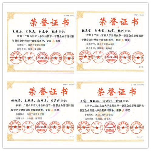 近日,第十二届山东省大学生科技节传来喜报,我校金融财会学院朱文波、苏萍、宋宇佳、侯国强、刘瑞前等教师指导的8支参赛队伍,在智慧企业财税审经营模拟赛和智慧企业财务共享经营模拟赛两项比赛中,各获4个三等奖。