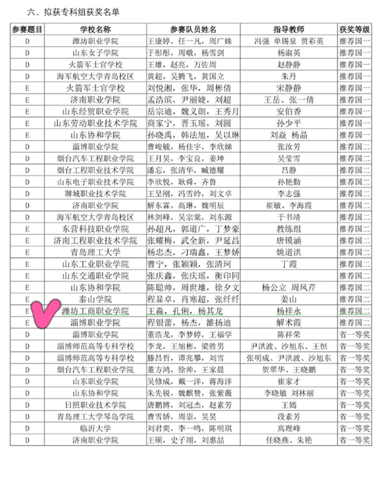 2020年10月3日,全国大学生数学建模竞赛山东省数学建模组委会公布了2020年全国大学生数学建模竞赛山东赛区获奖名单,我校公共教学部数学教研室杨祥永、焦潍苹两位老师精心指导下的2019级机电一体化技术专本贯通班王淼、孔俐、杨其龙组成的参赛团队荣获佳绩,被推荐参加国家二等奖的评选。