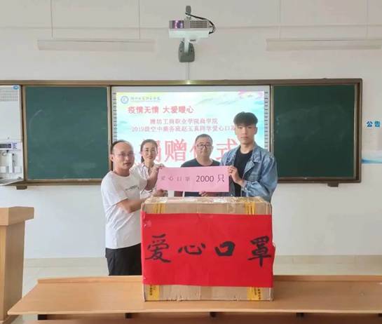 赵玉真同学是2019级空中乘务班的班长,居家抗疫期间,他去当地的一家口罩生产厂做志愿者,为我校学生争取了2000只口罩,全部无偿捐献给了我校。学校表示将严格管理、妥善分配使用这些爱心口罩。商学院负责同志代表全体师生接受了这批爱心口罩,并向捐赠者赵玉真同学给予诚挚的感谢和高度的赞扬。