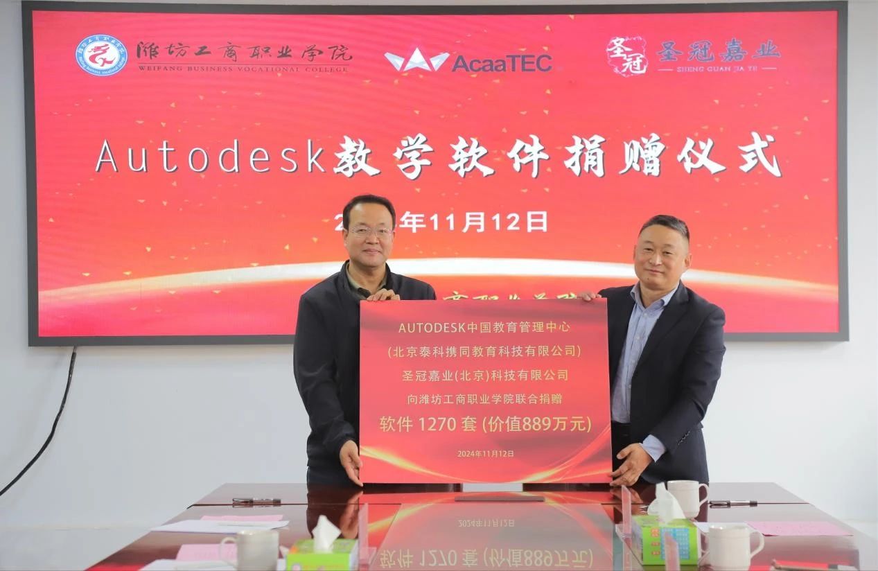 11月12日上午,Autodesk中国教育管理中心(北京泰科携同教育科技有限公司)、圣冠嘉业(北京)科技有限公司向潍坊工商职业学院联合捐赠软件仪式在图书楼516会议室举行。潍坊市产教融合研究院院长冯秀红,圣冠嘉业(北京)科技有限公司董事长,中国职业技术教育学会原国际部副主任王晓文,欧特克公司中国教育中心副总经理张永军,潍坊云汇智能科技有限公司董事长马荣静,我校校长张绍秋,副校长、经济学校校长唐德良,副校长郑明言,合作办学处处长侯国强等出席捐赠仪式。