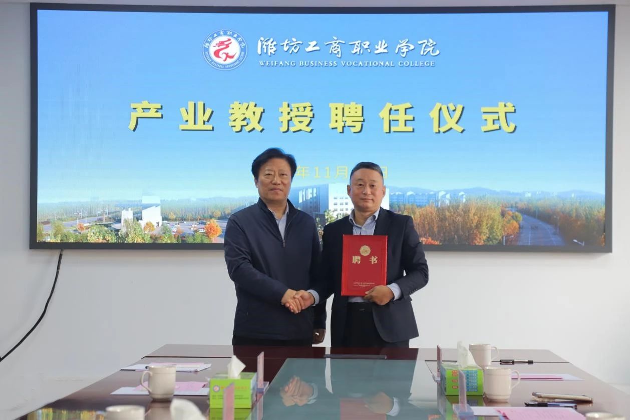 郑明言副校长和王晓文主任签订捐赠协议,张绍秋校长为王晓文主任颁发“产业教授”聘书。